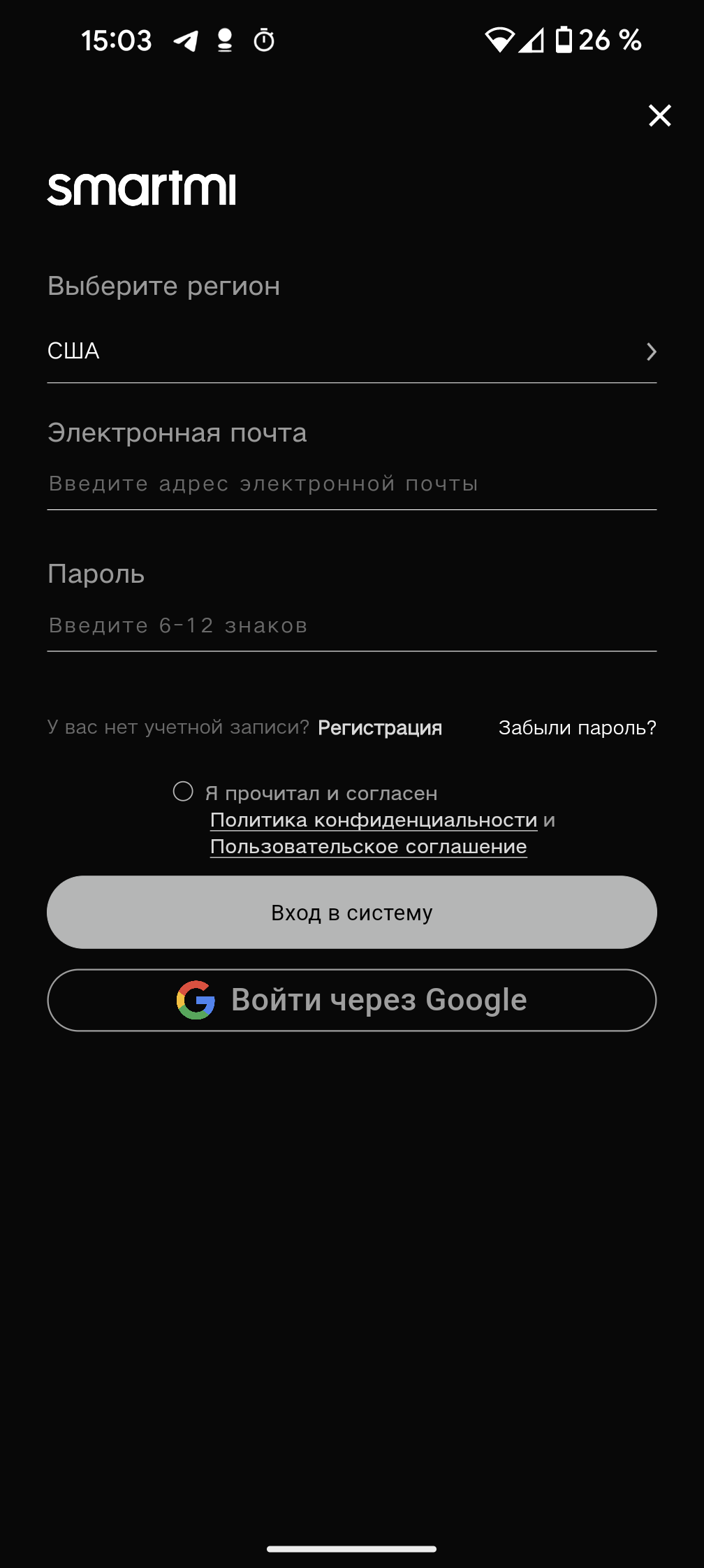 Для использования приложения необходимо принять положение о конфиденциальности и зарегистрироваться, используя подтвержденный адрес электронной почты. Можно воспользоваться также аутентификацией Google.