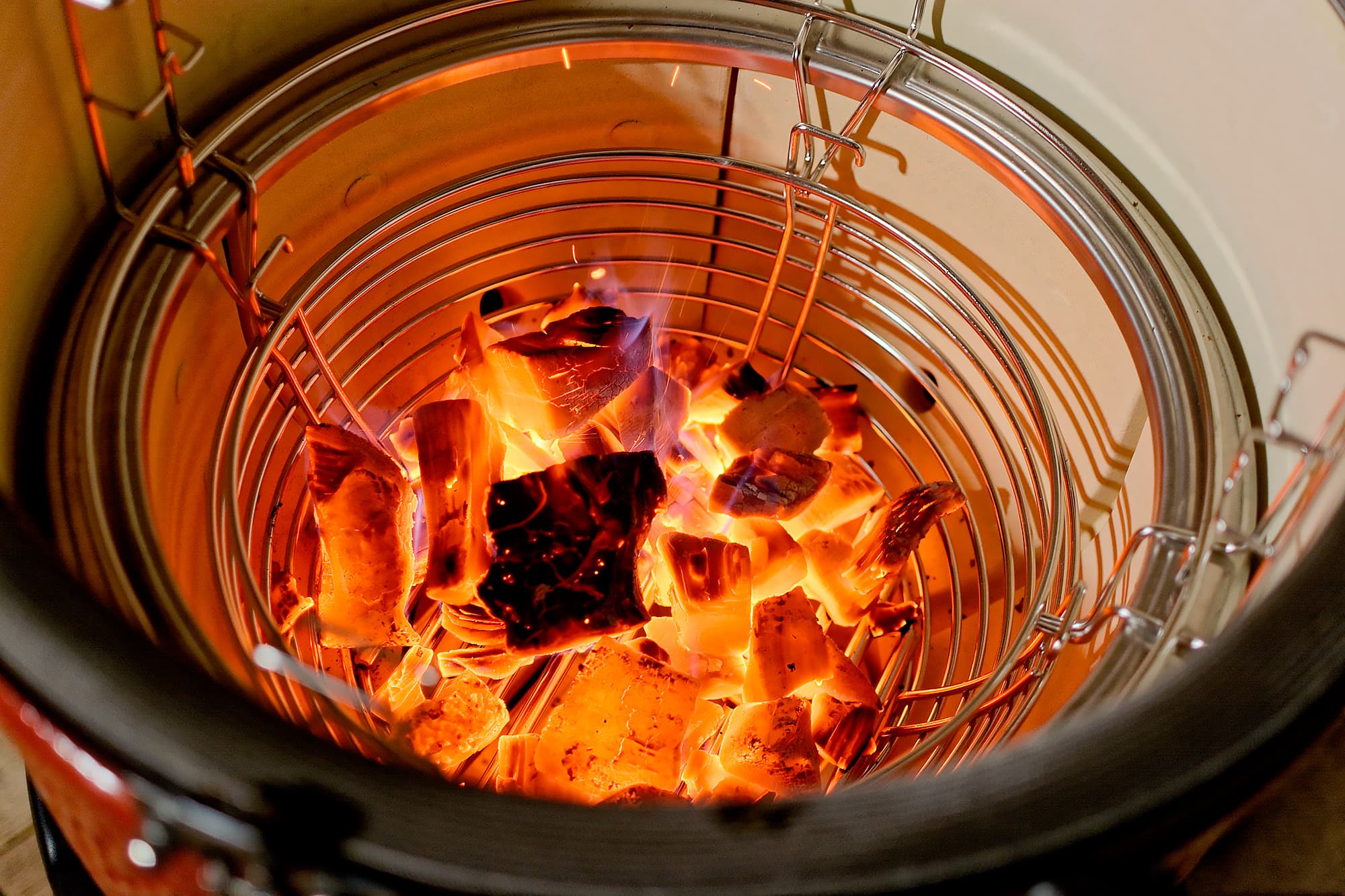 Простецкий чугунный колосник традиционных керамических грилей заменила «мискообразная» камера сгорания, сделанная из толстого стального прута. И не только из эстетических соображений.