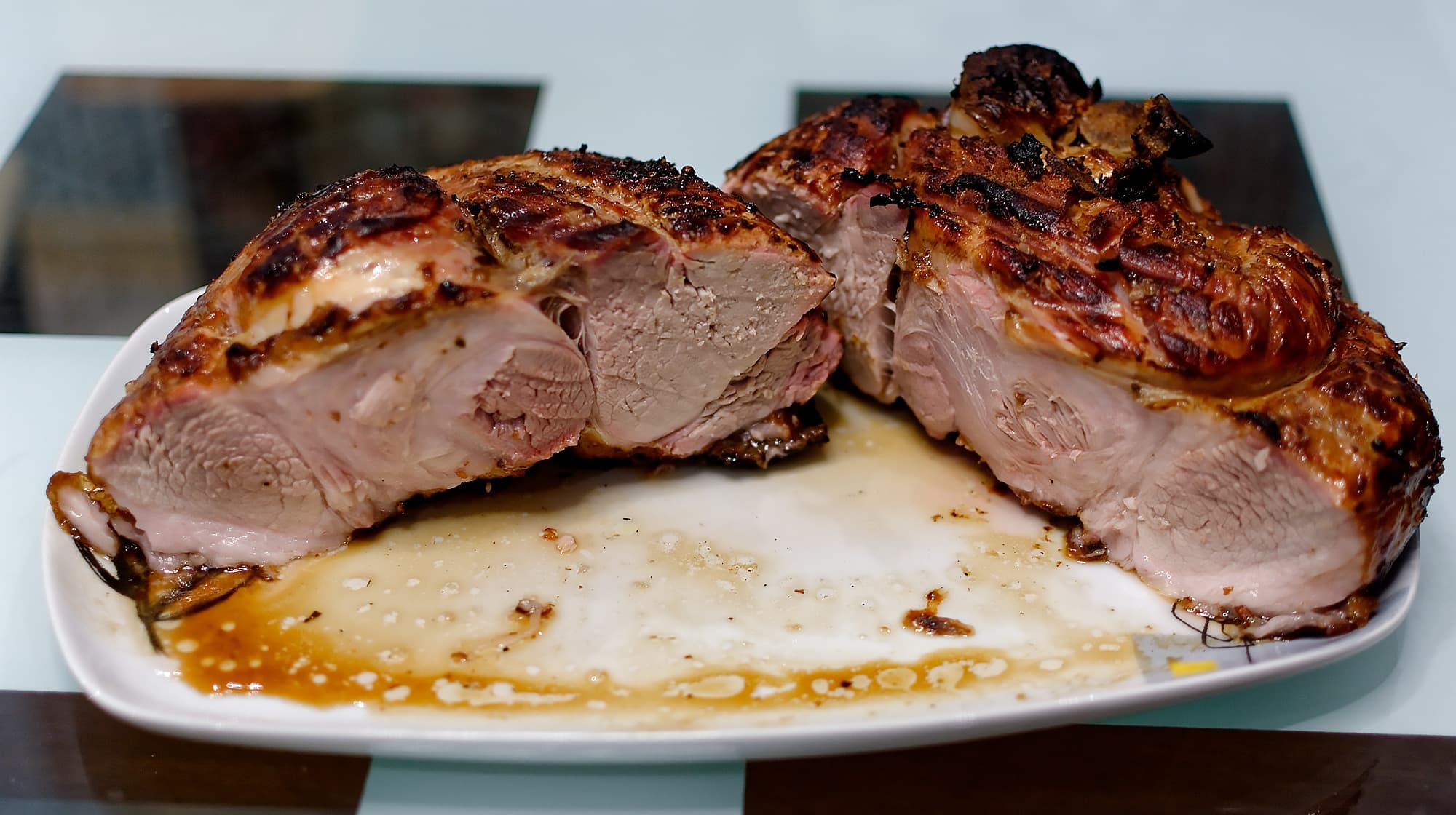 Сняли с гриля и дали полежать — мясо рульки оказалось нежным, шкурка и все хрящики и сухожилия коллагенизировались и стали нежными, как холодец. Но больше всего нам понравились яблоки: они остались целыми, лишь немного потрескавшись снаружи, и приобрели необычайно деликатную структуру: такими бывают яблоки внутри новогоднего гуся.