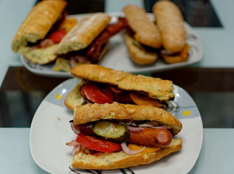 Помимо колбасок, хлеба и бекона, мы использовали для начинки хот-догов свежие помидоры, маринованные огурцы, красный крымский лук, перец халапеньо, сладкую горчицу, кетчуп и майонез: каждому едоку по желанию.