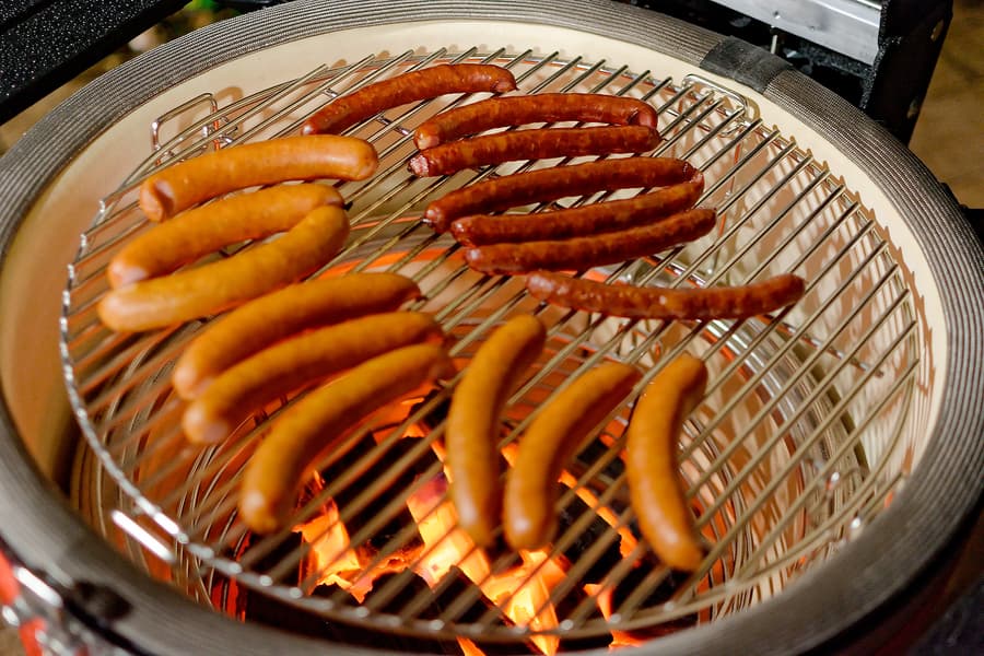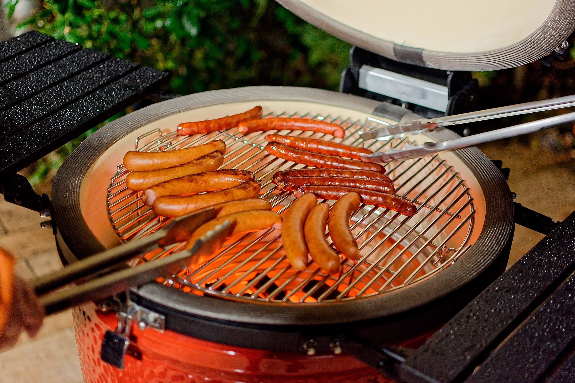 Когда угли достаточно разгорелись, мы приступили к обжарке продуктов. Сначала — колбаски для гриля двух видов, благо найти приличных производителей сейчас не так уж сложно.