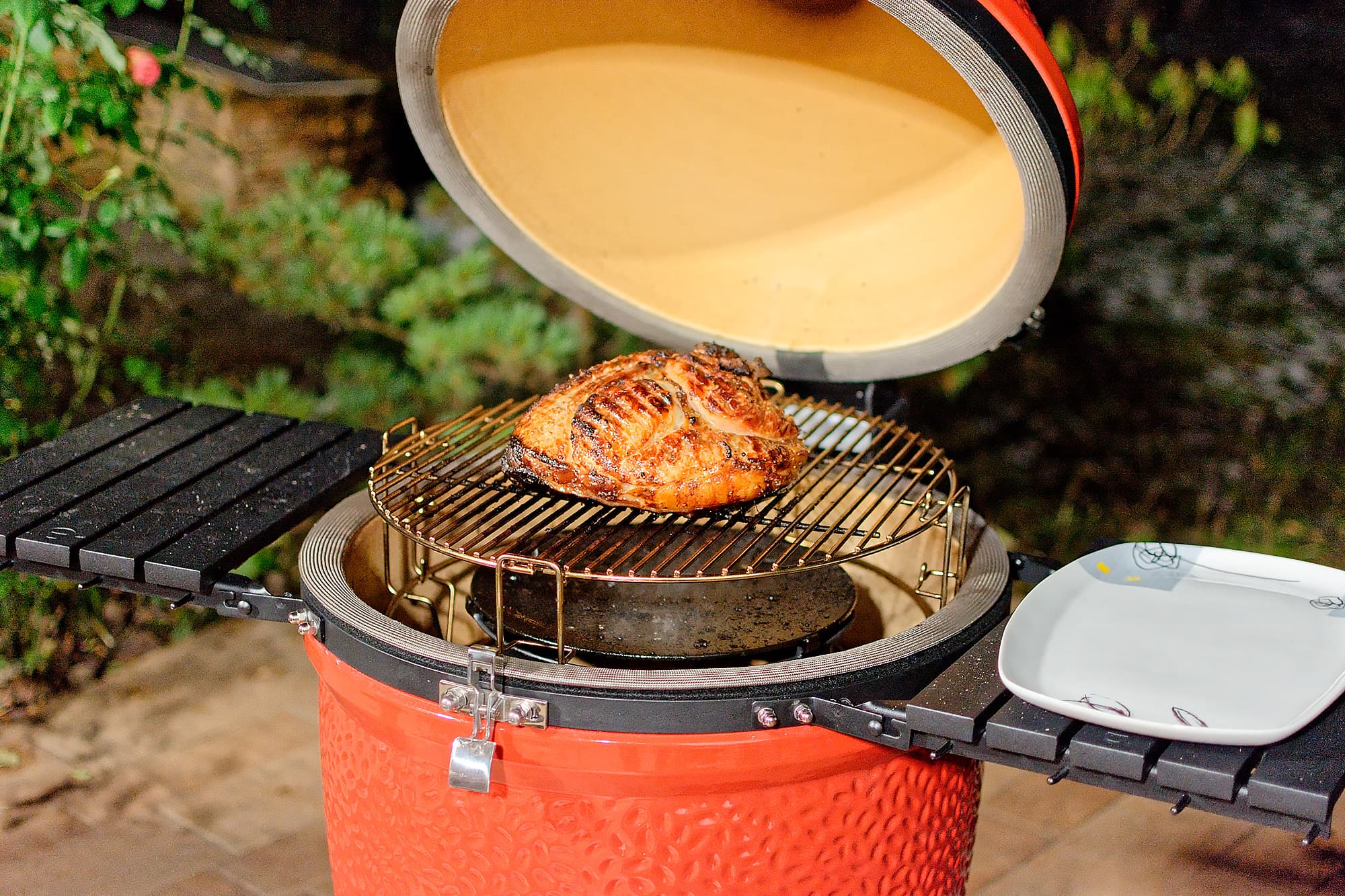 Мы готовили блюда и на прямом жаре, то есть над углями, используя регулировку решеток по высоте и возможности засыпать как полную, так и половинную порцию углей, и с помощью жароотсекателя на средних и низких температурах, а также использовали фирменный камень для пиццы, «разогнав» Kamado Joe Classic III до впечатляющих температур под крышкой.