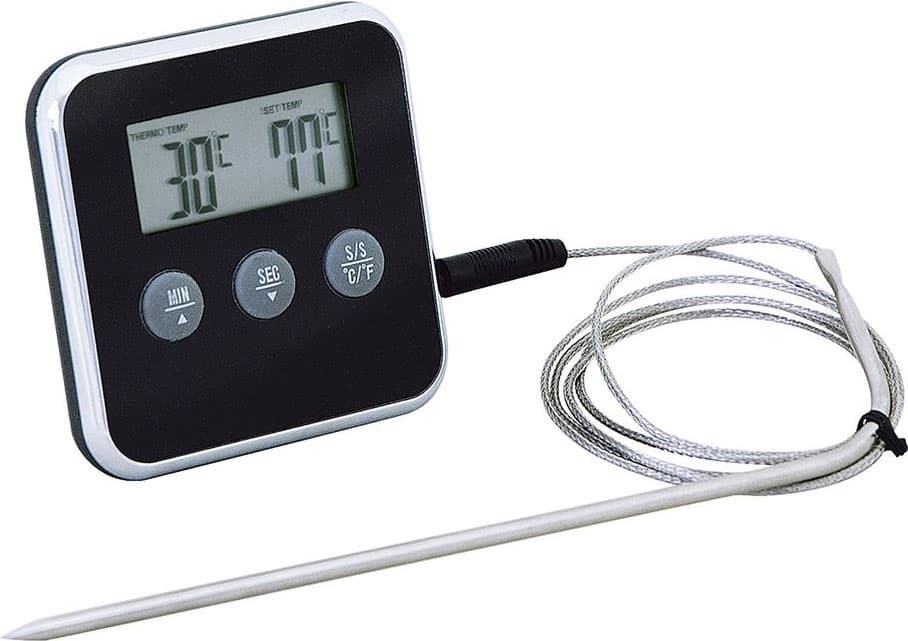 Самая простая функция, доступная даже для недорогих электронных моделей, это наличие таймера и подача звукового сигнала при достижении заданной температуры. Практическая польза очевидна: с помощью такого термометра можно засечь нужное время приготовления либо контролировать температуру продукта дистанционно. Достаточно выставить нужную температуру перед началом приготовления — и устройство сообщит вам с помощью звука (писка) о том, что температура внутри куска мяса достигла необходимых значений. Повар, таким образом, может спокойно заниматься другими делами вместо того, чтобы стоять у плиты в ожидании момента, когда пришла пора выключить огонь или убавить нагрев.