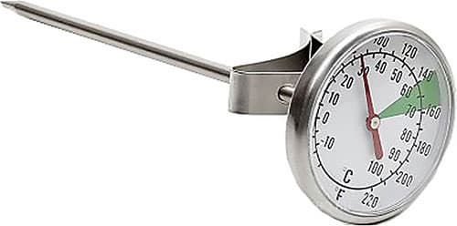 - Ряд механических термометров, рассчитанных на специфическое использование, имеют специальные пометки на табло, позволяющие пользователю легче считывать данные. Так, например, если вам нужен специальный термометр для контроля температуры молока для кофе, то есть смысл обратить внимание на модели, в которых нужная температурная зона будет выделена специальным цветом (они так и называются: «термометр бариста»).