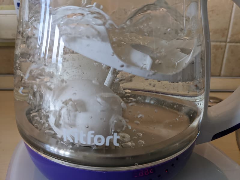Чайник довел воду до 100 °C и снизил мощность нагрева, поддерживая кипение в течение 8 минут. Когда время вышло, прибор издал звуковой сигнал и выключился. Перевернувшуюся подставку мы извлекли вилкой, а яйца — ложкой.