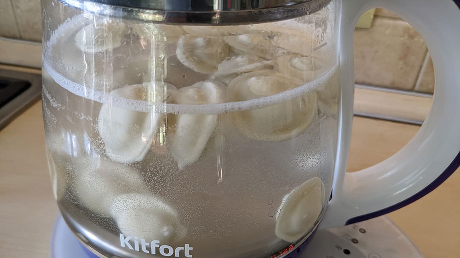 Наполнив чайник подсоленной водой, мы включили его, дождались, пока температура на дисплее достигла 95 °C, и в этот момент засыпали пельмени: логичнее сделать это в конце фазы активного кипячения.