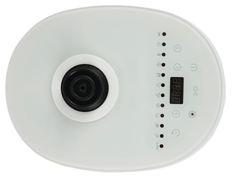 Верхняя панель базы сделана из закаленного стекла с белой подложкой. Помимо традиционной контактной группы, на ней мы видим цифровой дисплей, сенсорные кнопки управления и длинный ряд индикаторов режимов: их у нашего чайника целых одиннадцать.