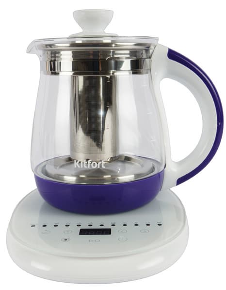 На емкости у дна нанесен логотип производителя, а ближе к ручке — отметки уровня воды: 0,8, 1,3 и 1,8 литра. Ручка и основание сделаны из фиолетового пластика с белыми элементами. Для тех, кому такое сочетание цветов не нравится, производитель предлагает бело-салатовое и бело-бирюзовое исполнение этой же модели.