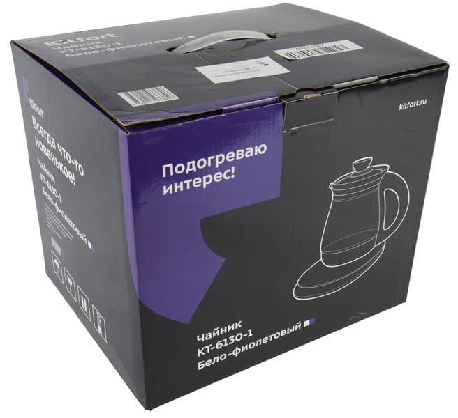 Чайник поставляется в коробке, которая, как это свойственно Kitfort, оформлена в черно-белой гамме с вкраплением фирменного фиолетового. Привычны также схематическое изображение устройства на передней стенке и непременный слоган — свой для каждого класса бытовой техники. Для KT-6130 производитель выбрал девиз «Подогреваю интерес!».