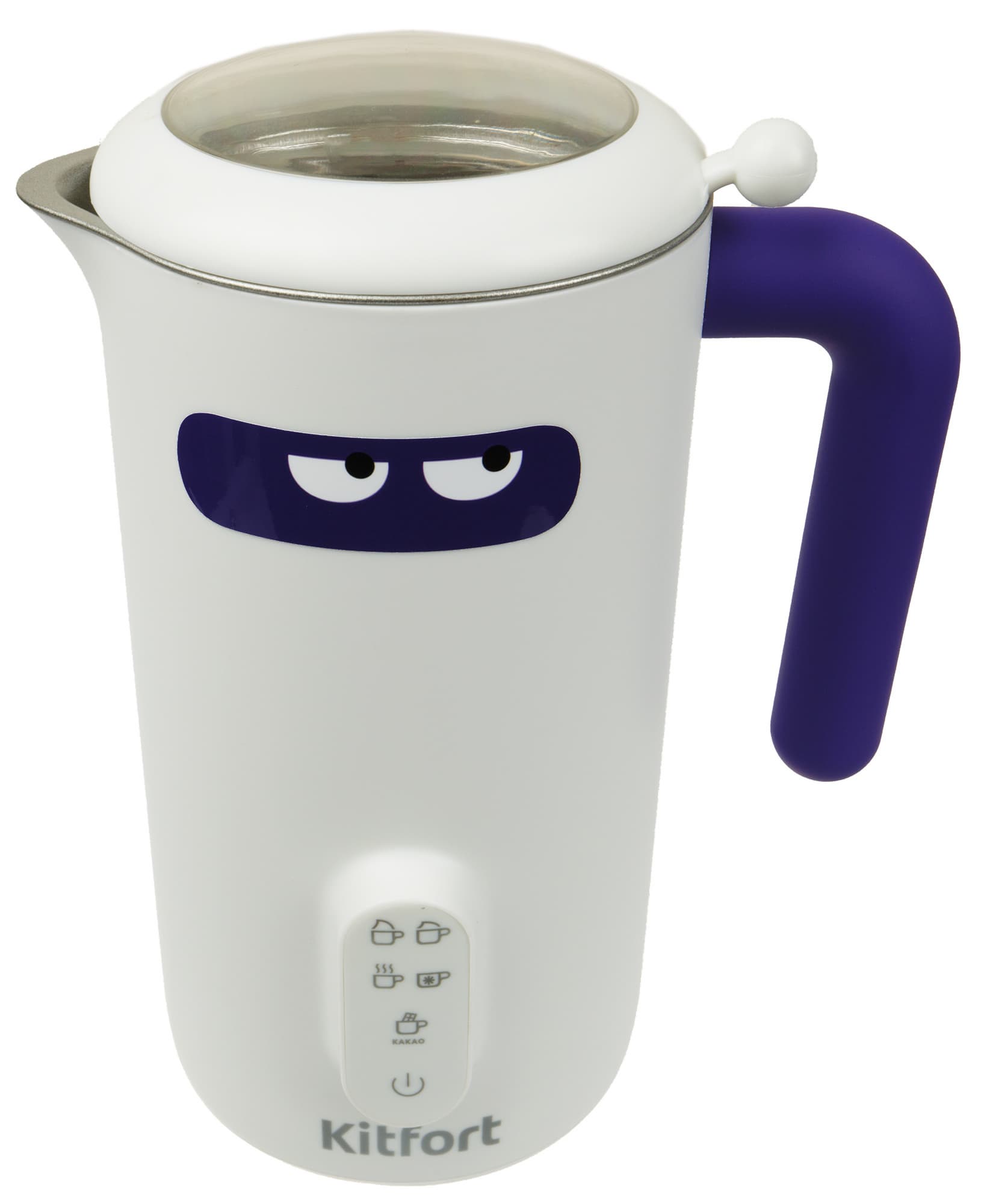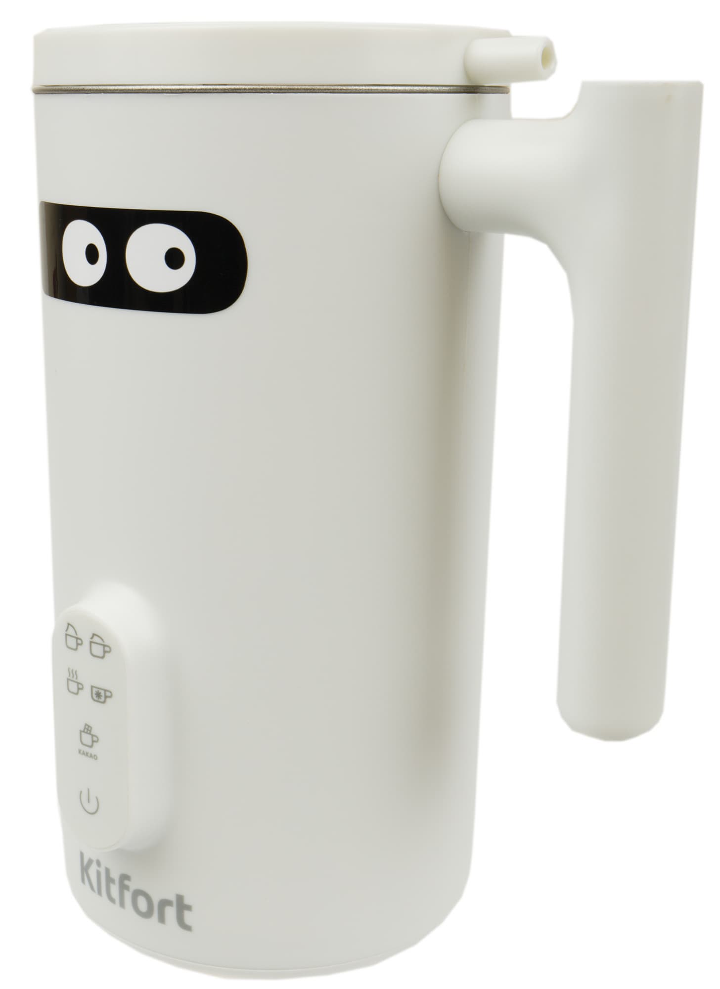Начнем наше знакомство с модели КТ-774-1. Прибор производит симпатичное, милое впечатление. Основные причины тому — нежные цвета, матовый пластик и наклейка с глазами, которая «очеловечивает» устройство (кстати, ее можно без труда отклеить и приклеить на другое место). Давайте рассмотрим капучинатор поближе.