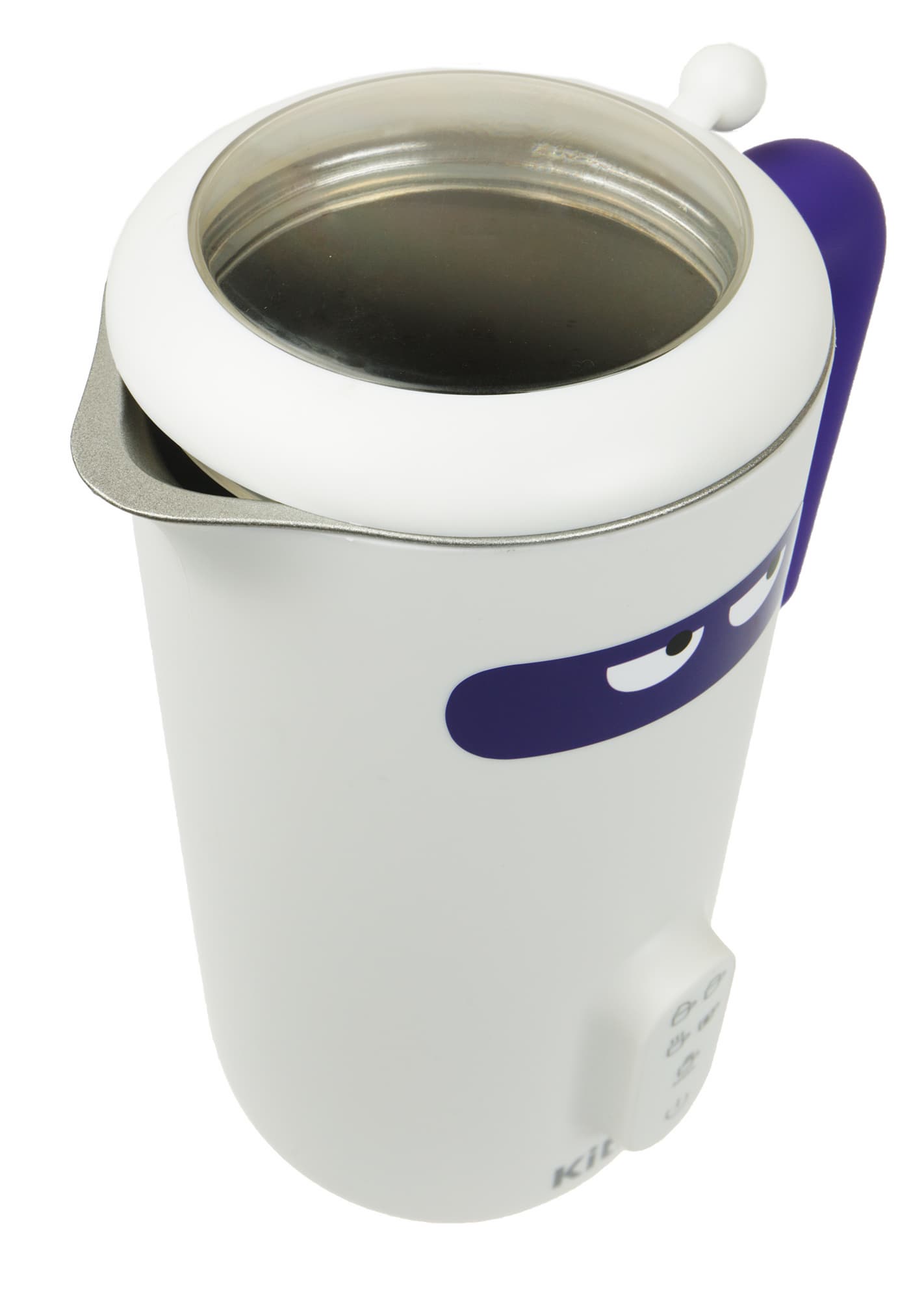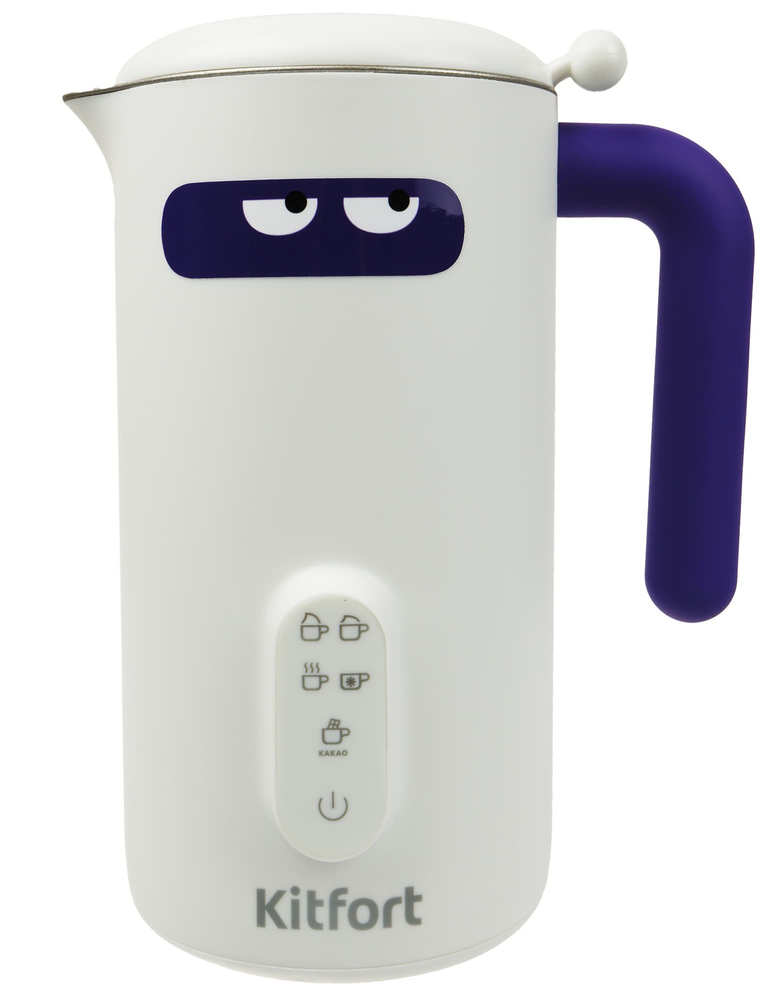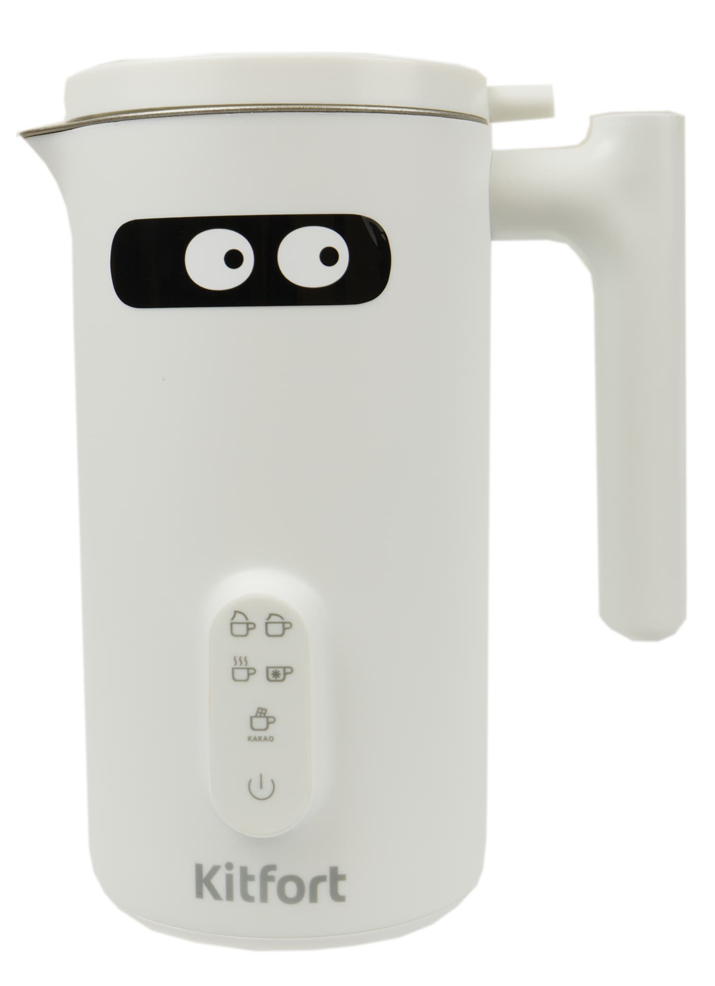 На передней стороне корпуса мы видим наклейку с глазами. Снизу расположены панель управления и логотип Kitfort.