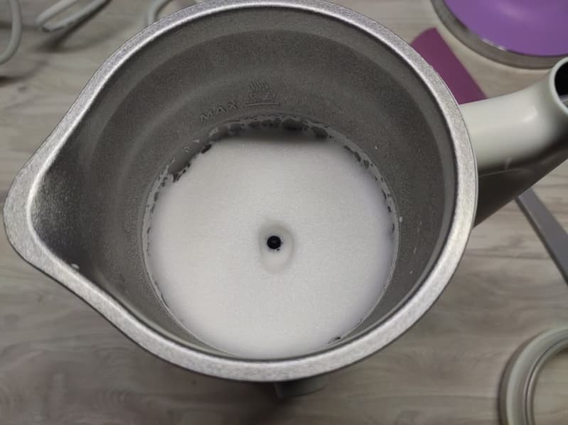 Наш опыт показал, что уход за прибором не доставляет больших сложностей. Небольшое количество молока налипает на стенки емкости (или на дне — особенно при длительном подогреве), но легко очищается с помощью обычной губки. На насадке-вспенивателе иногда остается слипшееся молочная пенка, которая, опять-таки, легко смывается проточной водой. Мы готовили по несколько кофейных напитков с молоком подряд, и не почувствовали никакого дискомфорта.