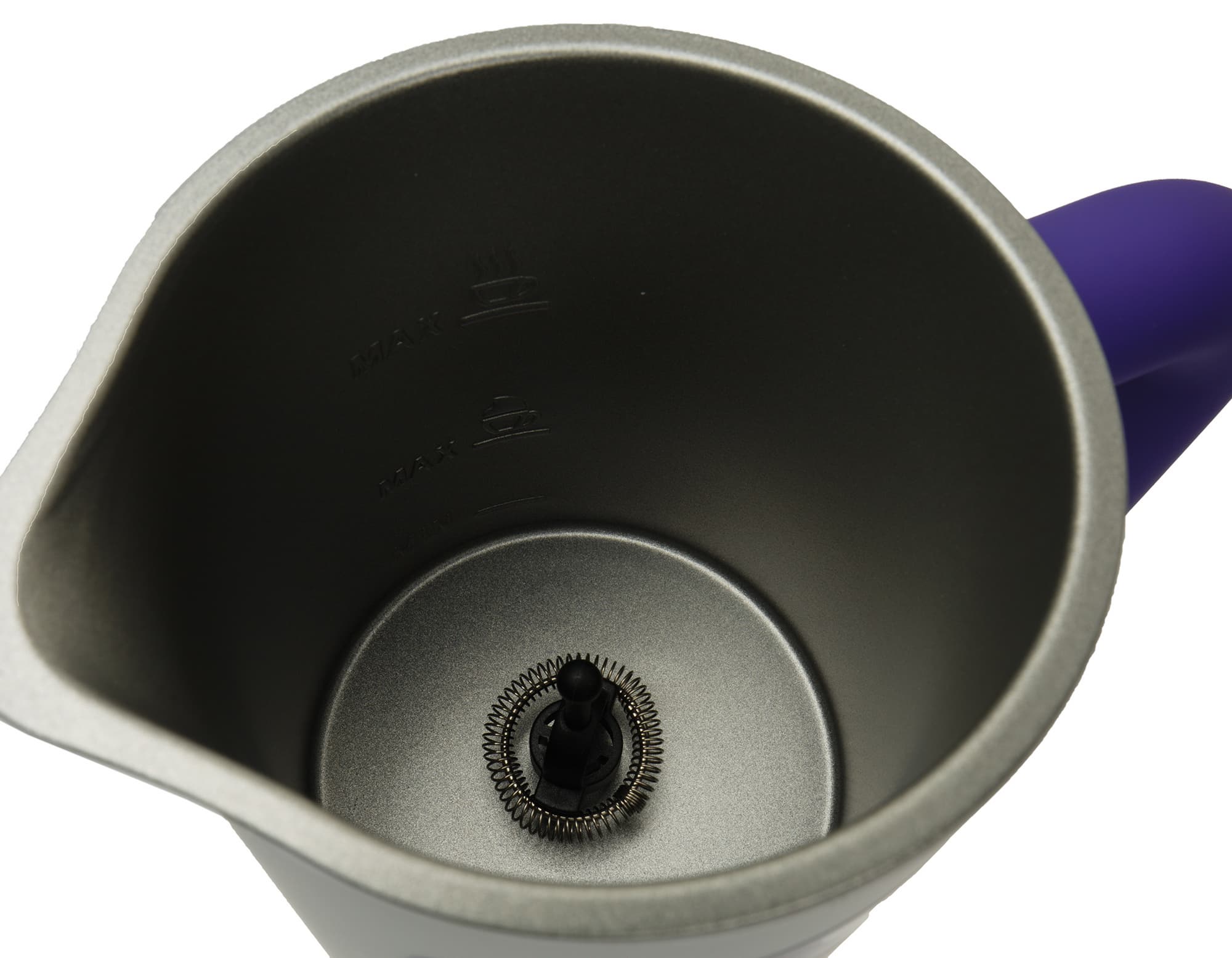 На боковых стенках корпуса нанесены отметки, соответствующие минимальному и максимальному объему молока. При этом отметки Max тут две: нижняя соответствует подогреву молока со взбиванием, а верхняя — просто подогреву.