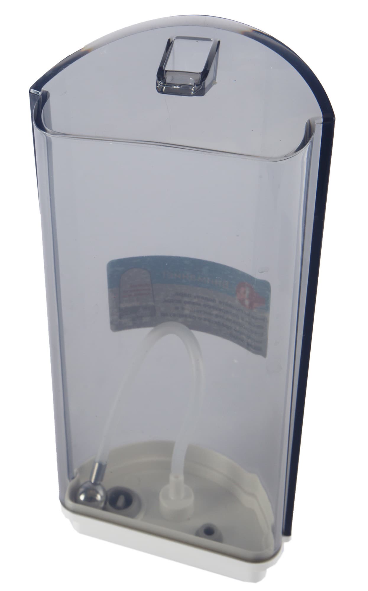 Для того, чтобы вынуть резервуар, нужно поднять кнопку-блокиратор вверх, а обратно вставить можно, просто нажав на него до легкого щелчка. Заполнение водой происходит через небольшое отверстие, находящееся рядом с отверстием для забора воды и закрытое силиконовой заглушкой. В резервуаре забор воды организован через патрубок с тяжелым шариком на конце. Шарик падает в сторону наклона швабры, таким образом забор воды не зависит от угла наклона швабры при работе. В резервуар допустимо заливать только чистую воду, без добавок и моющих средств.