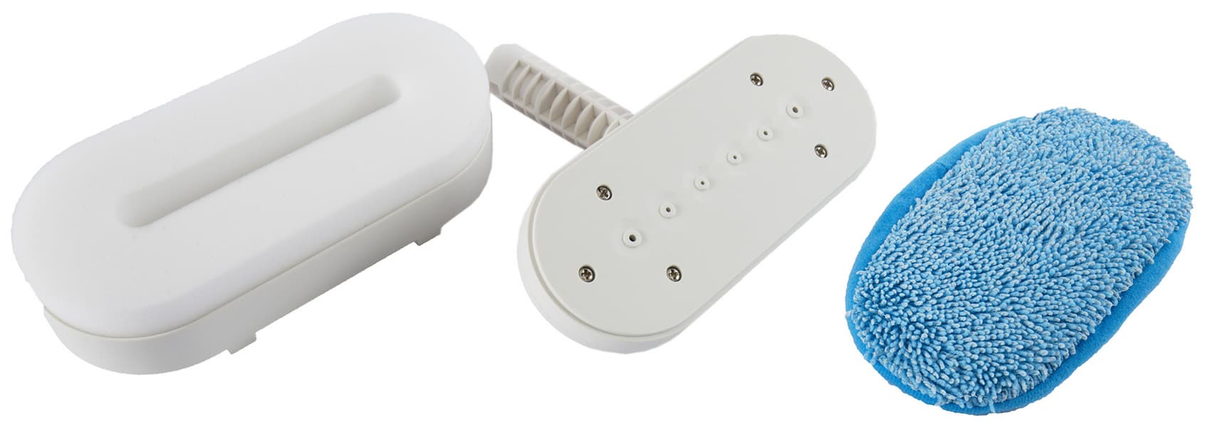 Насадка «3 в 1» предназначена для отпаривания и состоит из корпуса насадки, губки с держателем и тряпки для отпаривания. Тряпку можно надеть на насадку без губки.