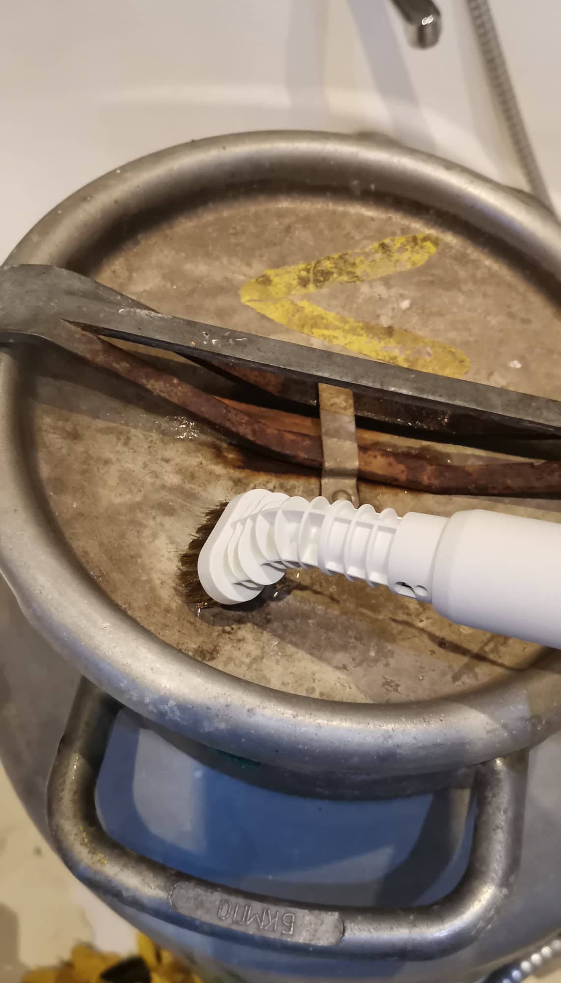 Мы использовали латунную и пластиковую щетку-насадку и чистили его паром больше получаса, но в красивый первозданный вид привести так и не смогли. По всей видимости, пар без химии тут бессилен.