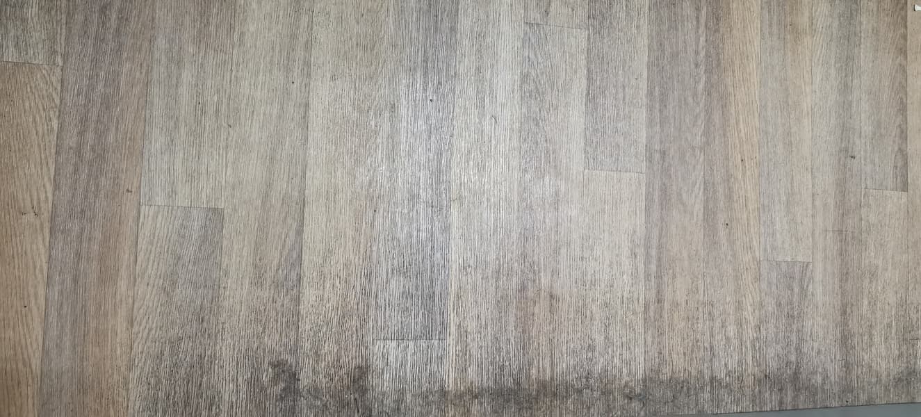 Мы нашли самое загрязненное место на линолеуме с глубокой текстурой — под боковой поверхностью шкафчика. Мыли с помощью насадки с тряпкой для пола. Так как рисунок на линолеуме глубокий, уборка заняла больше времени, чем на полу с плиткой.