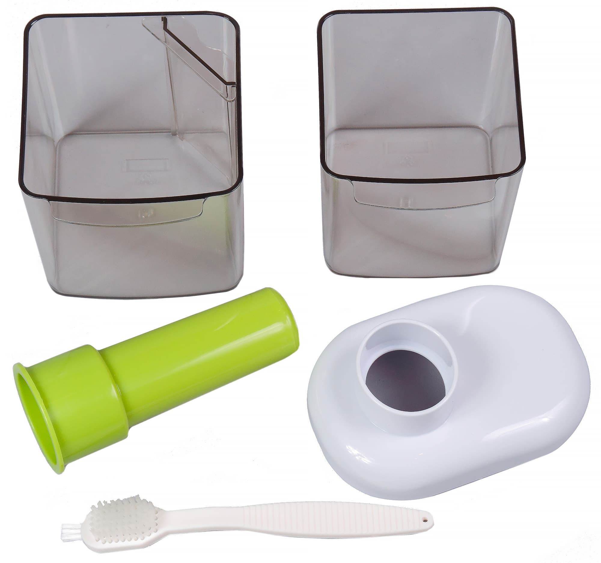Распаковав коробку, мы увидели полностью собранную соковыжималку, два квадратных контейнера для сока и для жмыха, насадку для более удобной подачи продукта, а также щетку для мытья соковыжималки после работы. Больше ничего в комплекте и не нужно, правда?
