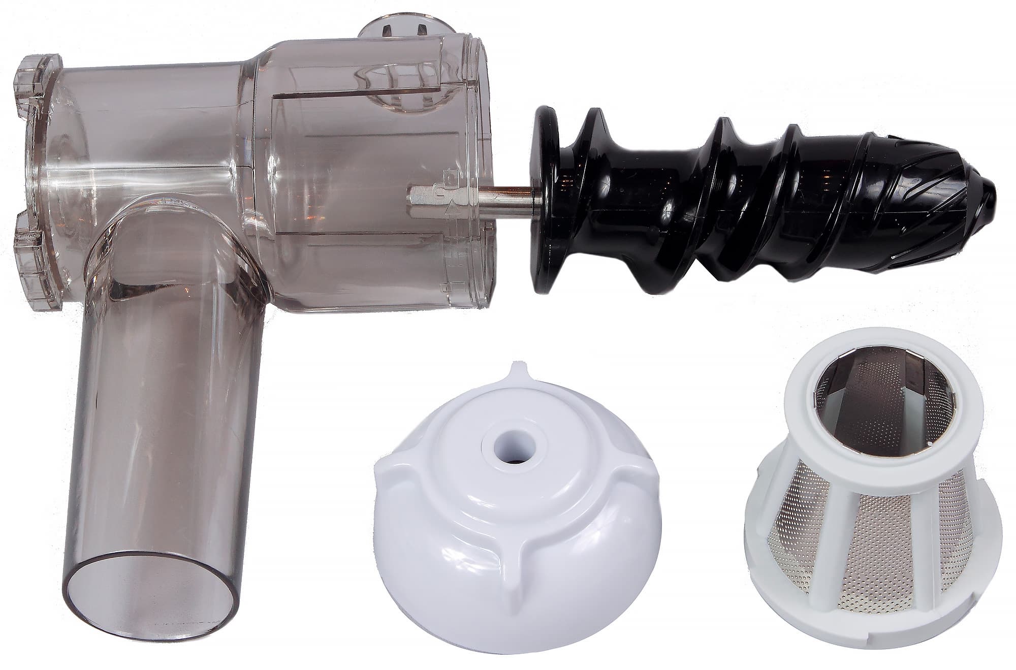 Чтобы разобрать собранную соковыжималку перед началом работы, пришлось приложить некоторые усилия. Легко отсоединившись от моторного блока, отжимный блок не спешил так просто разбираться на части. С некоторым усилием повернув заглушку с отверстием для выхода жмыха, мы приложили гораздо больше сил, чтобы снять фильтр для сока.