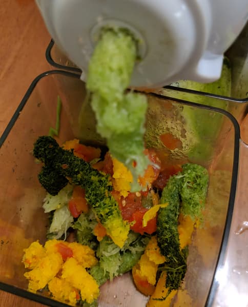 С капустой вышла вот какая штука. При отжиме капустного сока соковыжималка начала жутко скрипеть, заглушая даже громкий разговор. Из килограмма обычной белокочанной капусты за 11 минут 6 секунд у нас вышло всего 317 граммов сока, чистого, практически без мякоти. Все остальное — довольно сочный жмых. Думаем применить его в бигос.