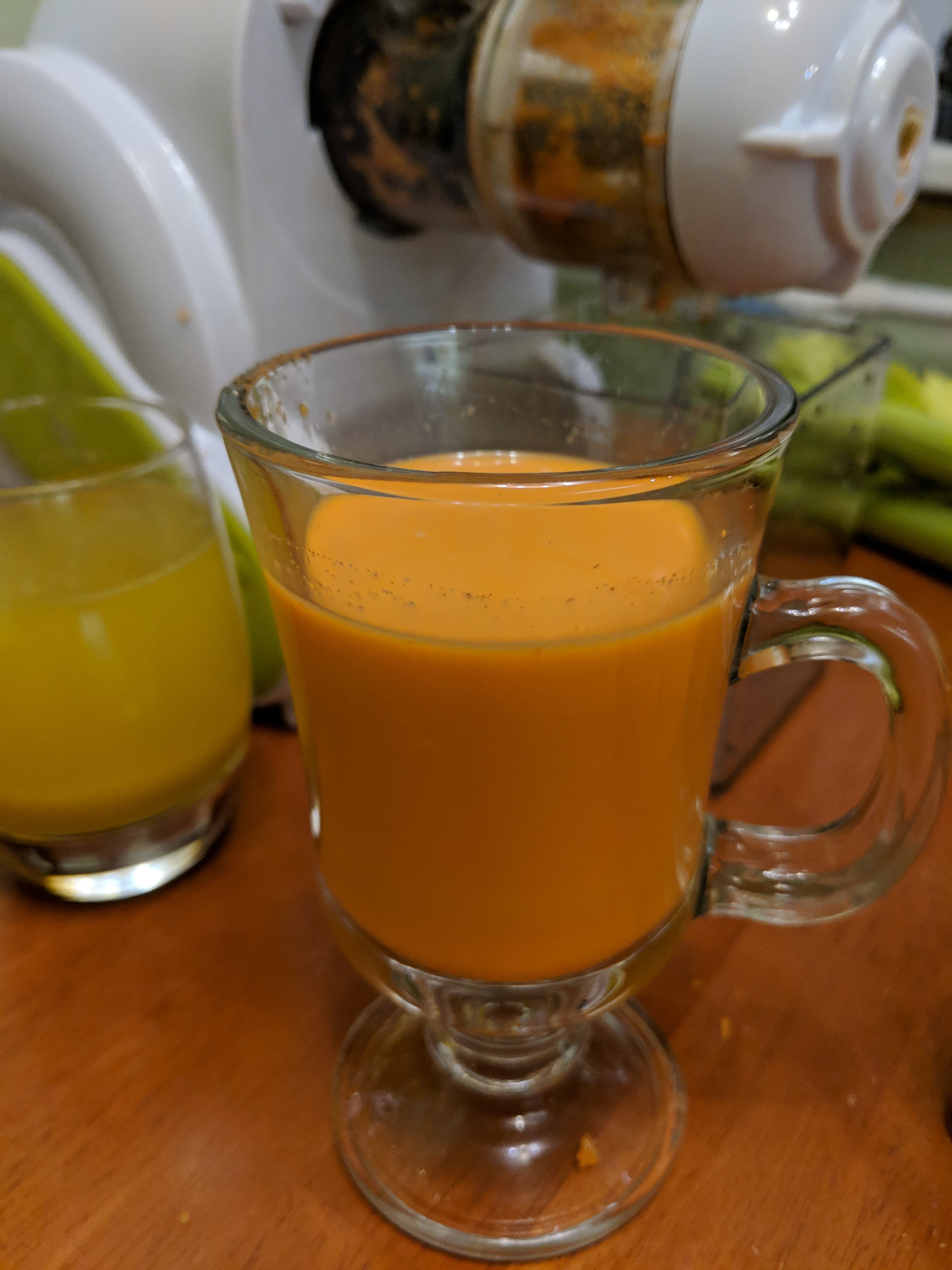 В процессе получается довольно сочный жмых, который можно прогнать через соковыжималку повторно или использовать в хозяйстве. Например, мы с ним приготовили морковный торт, а остатки добавили в постные щи, предварительно обжарив с луком. Можно и морковные котлеты сотворить.