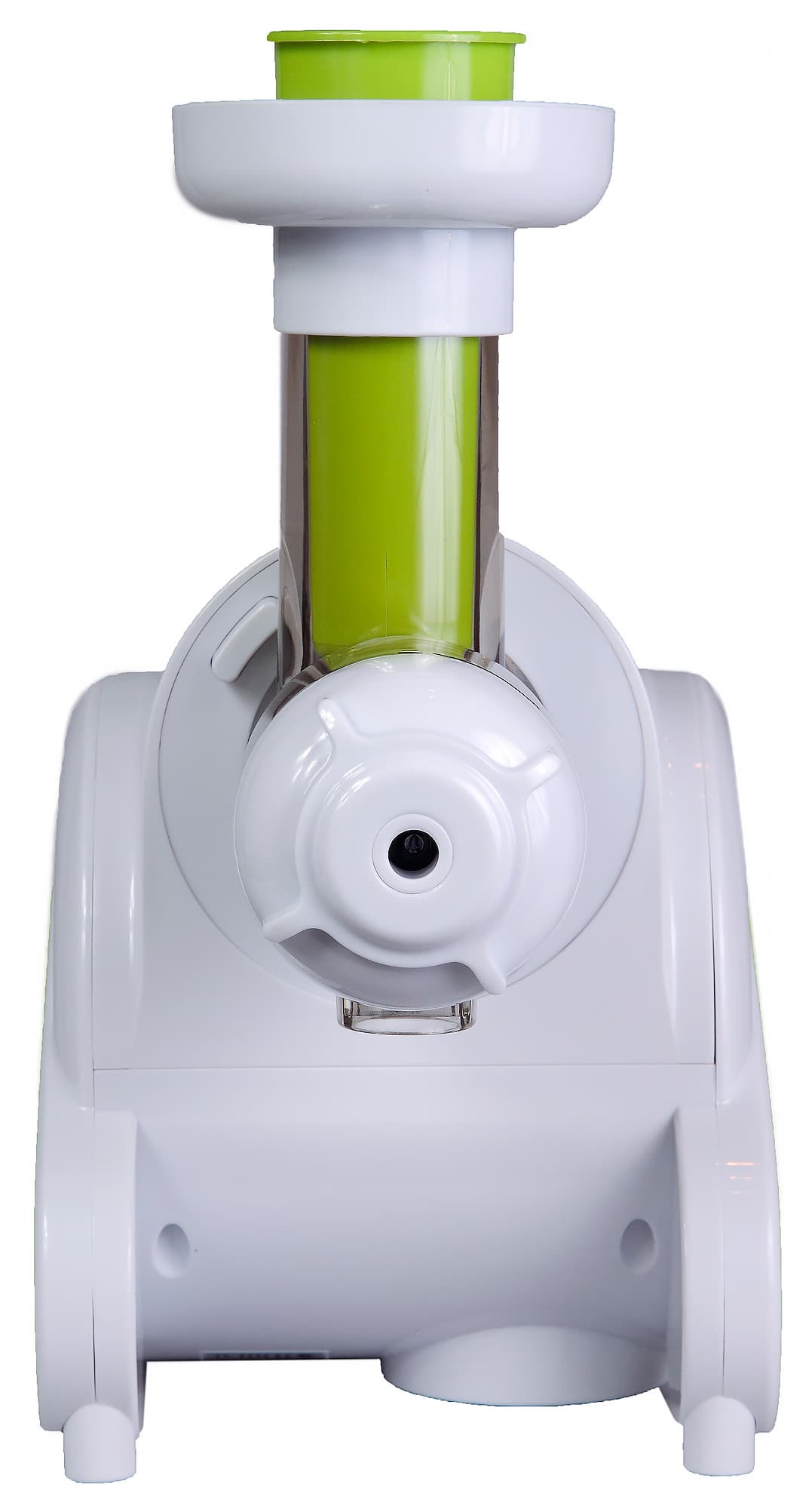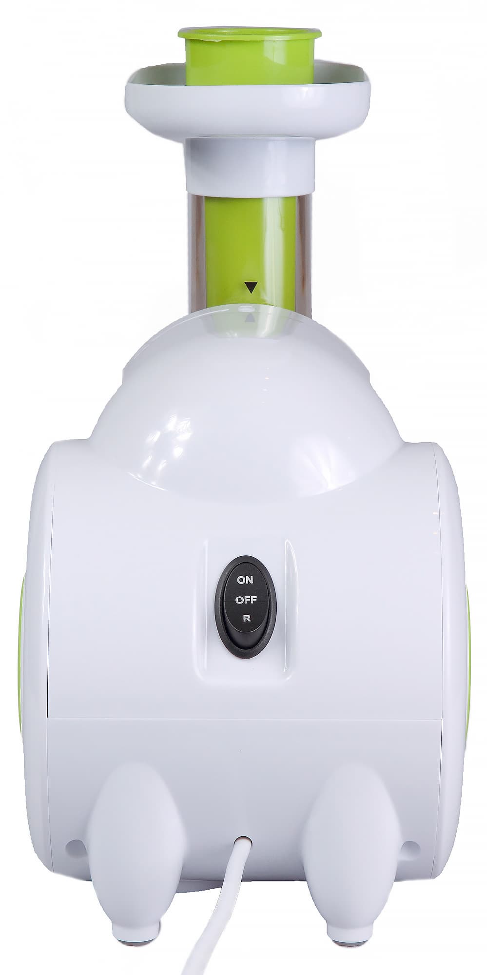 Все части прибора сделаны из качественного глянцевого или прозрачного пластика. Моторный блок белый с ярко-зелеными, травяного оттенка боковыми накладками. Заглушка для отжимного блока, сетка для сока и приемник для продуктов белые, корпус отжимного блока и контейнеры прозрачные, вал из пластика черного цвета с зеленым отливом, а толкатель нарядно-зеленый.