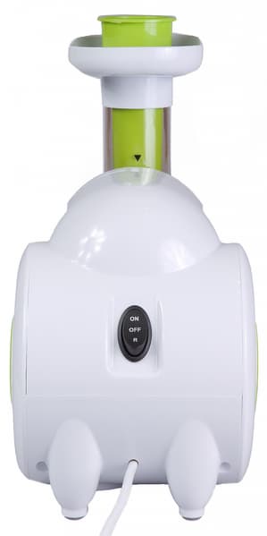 При работе оказывается, что отжимный блок не закреплен жестко на корпусе, а описывает небольшую окружность. Кажется, что соковыжималка водит жалом по сторонам. Впрочем, на качестве работы это не сказывается: сок мимо контейнера не проливается и жмых в разные стороны не летит. Но немножко боязно, что в какой-то момент отжимный блок вылетит из закрепляющего механизма на моторной части и отправится в свободный полет.