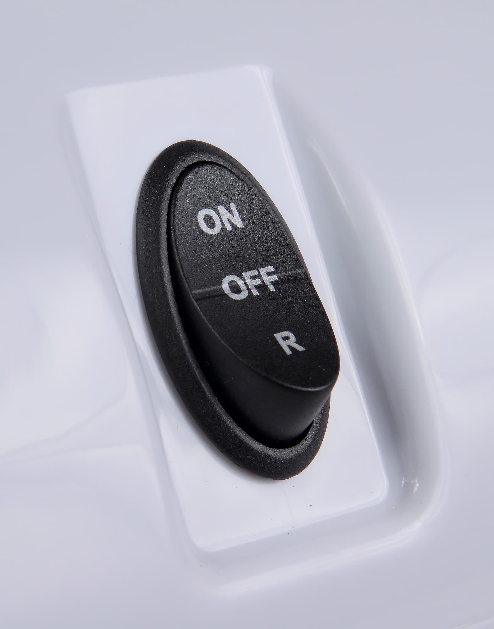 На корпусе моторного блока расположена единственная кнопка управления с тремя положениями — рабочее, выключенное и реверс.
