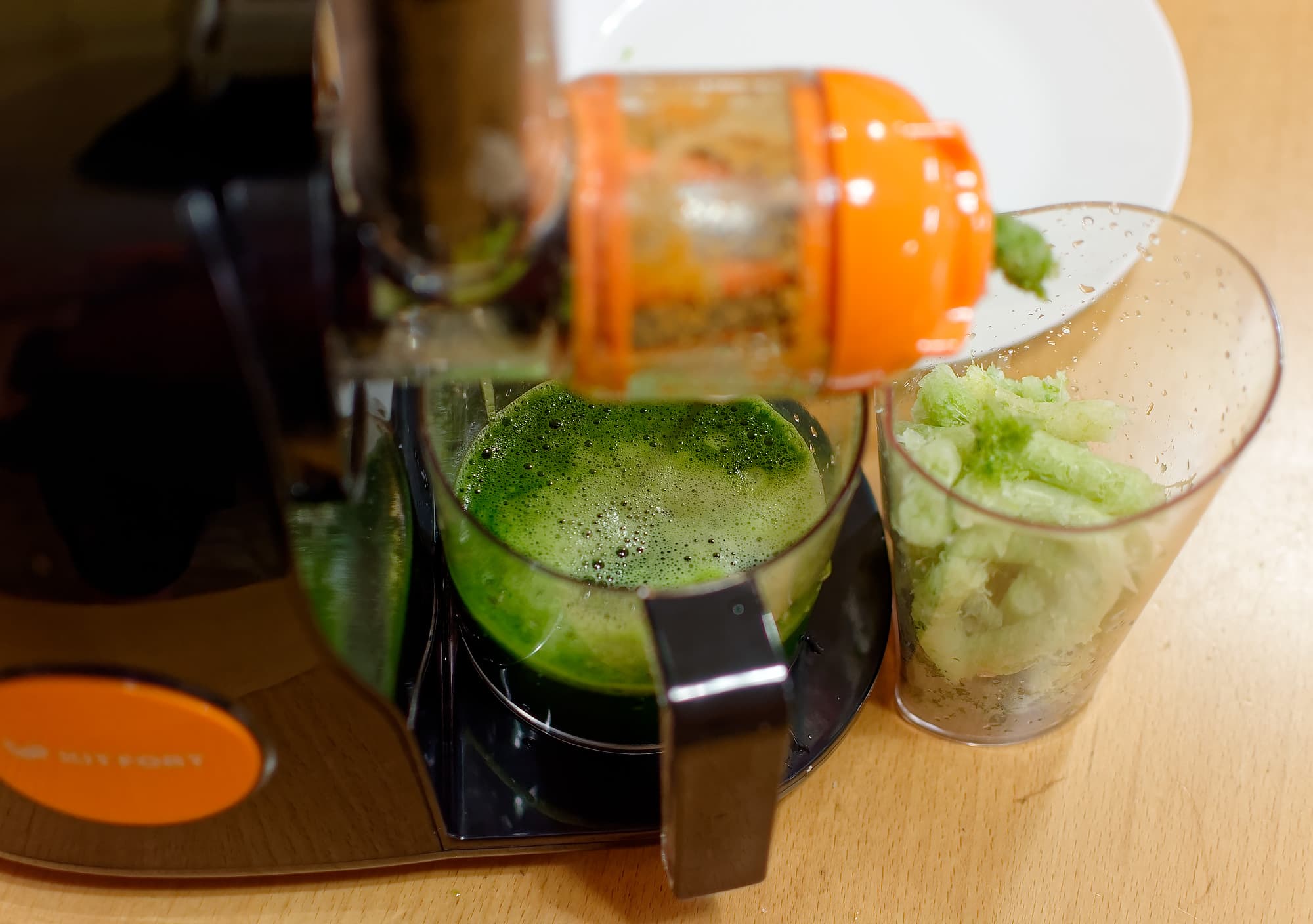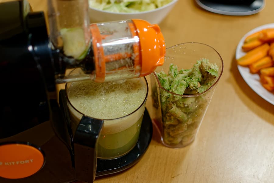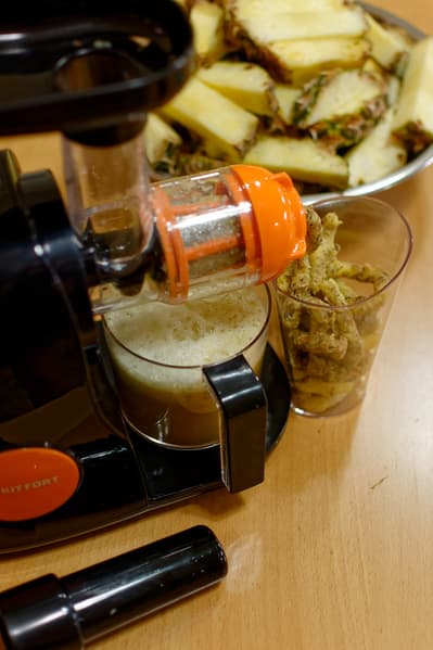 Это было... сложно. Капустные листы плохо захватывались шнеком (сказывался его маленький размер и небольшая глубина канавок), норовили влезть между стенками трубы и толкателем, блокируя его и не давая ни протолкнуть дальше, ни вынуть... в общем, развлекались мы с одним килограммом капустного сырья аж целых 10 минут и 5 секунд, получив в результате 400 граммов сока.