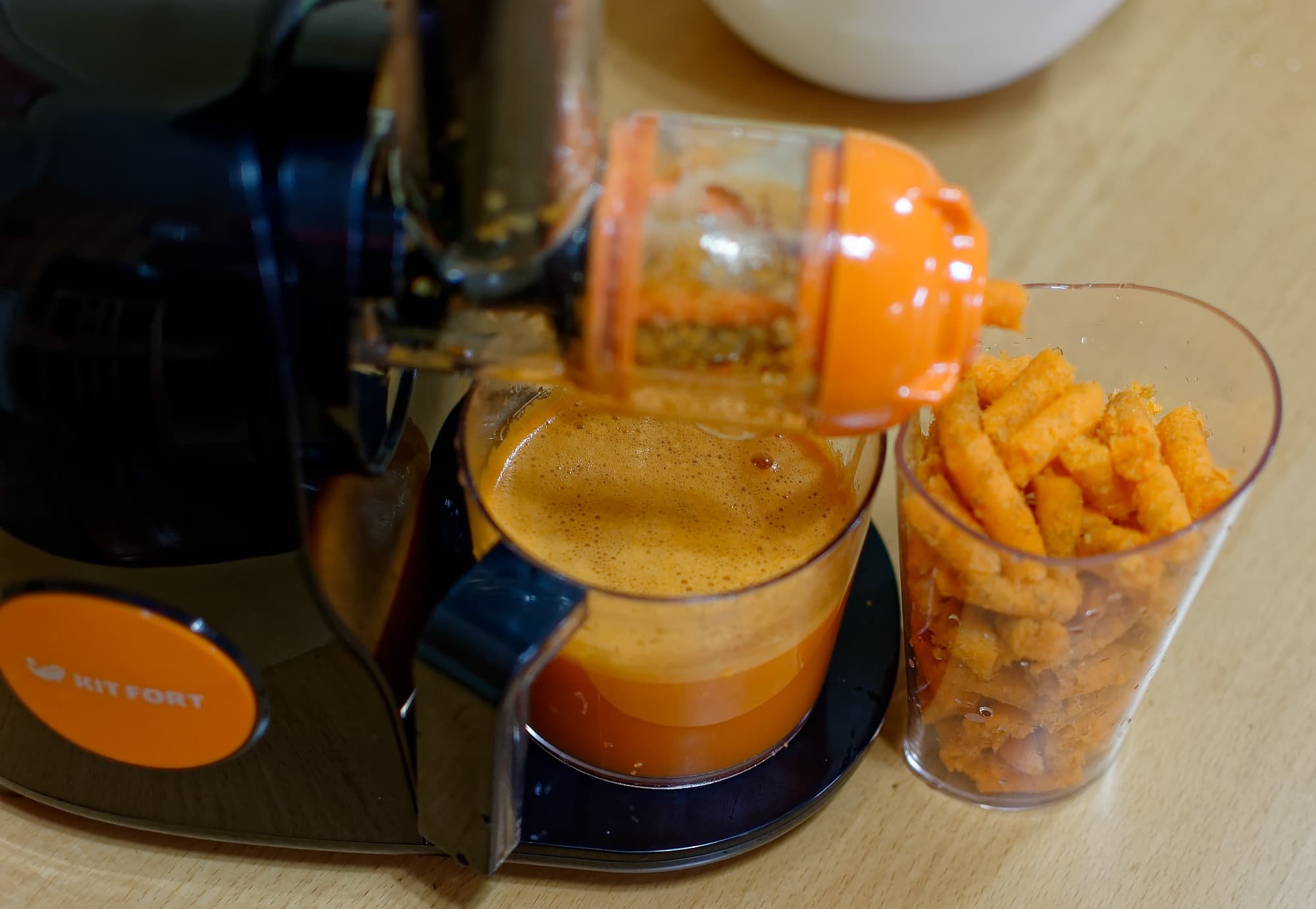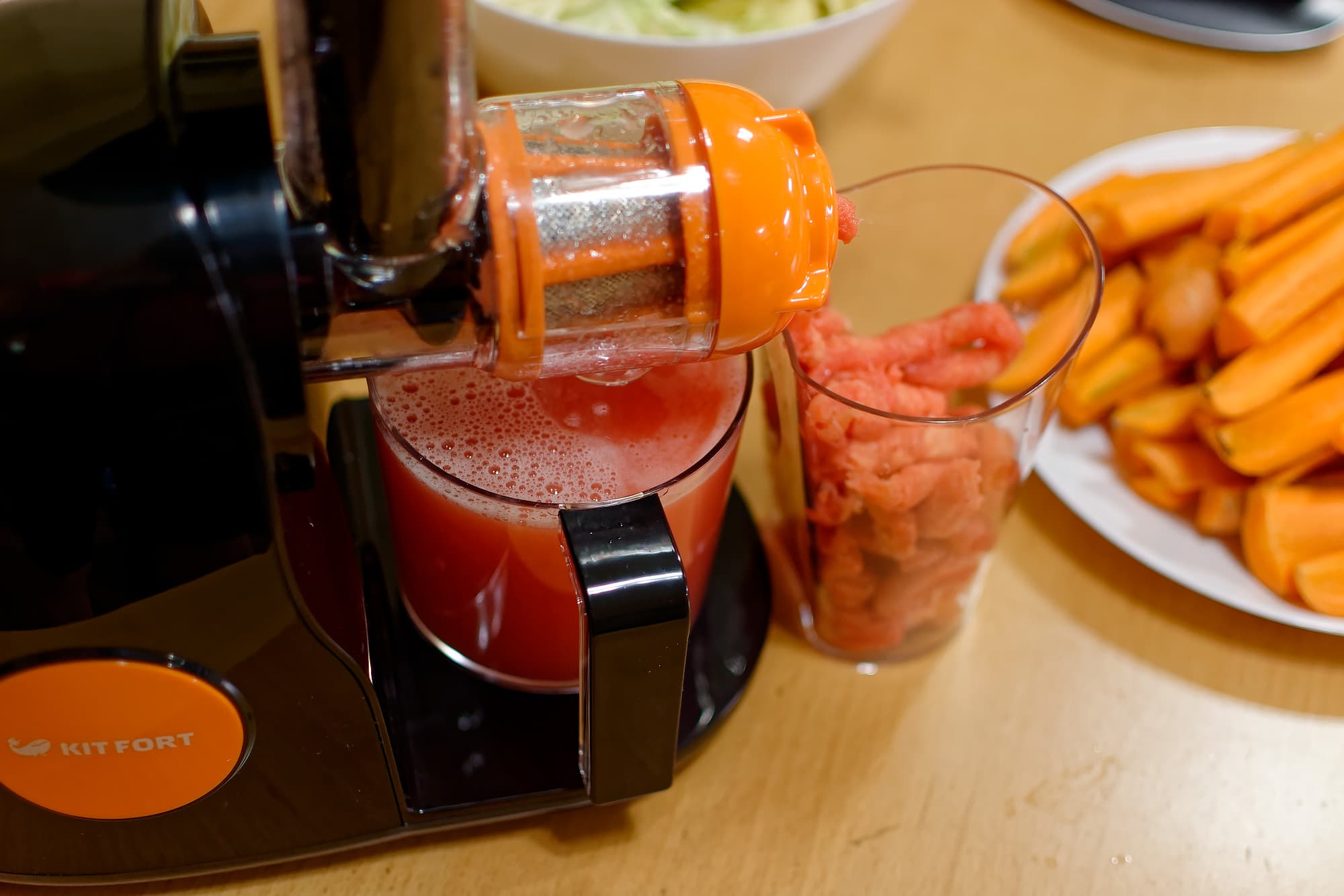Однако если углубиться в результаты тестов, то мы видим, что KT-1111 «подвели» результаты обязательной программы по овощам: моркови и капусте. Это позволяет нам предположить, что слабая эффективность проявляется у данного прибора при работе со «сложным», трудноотжимаемым материалом, а с сочными фруктами он справляется хорошо.