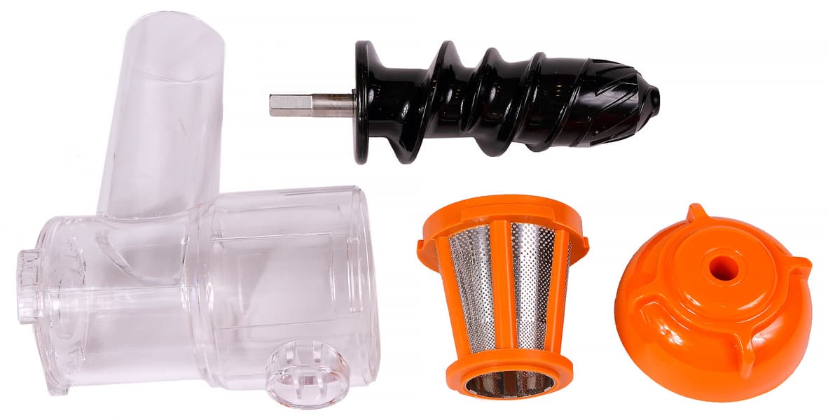 Сокоотжимающий узел легко и интуитивно понятно разбирается. Фильтр и шнек смотрятся совсем игрушечно, даже начинают возникать сомнения, как они справятся со всеми нашими тестовыми задачами. С морковью, например.
