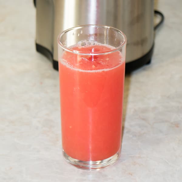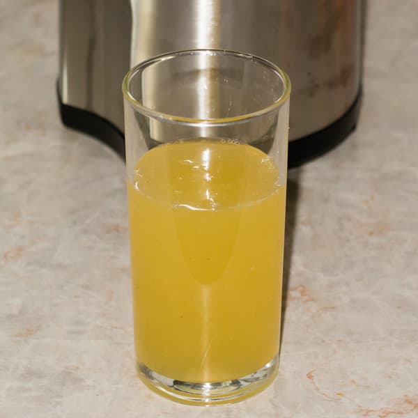 Вес трех грейпфрутов составил 1,056 кг. После отжима получили 486 г сока. Итак, выход составил 46%. Процесс занял чуть больше трех минут. Сок почти прозрачный, в целом без мякоти. Хотя в нем, как и в апельсиновом, иногда встречались волокна и мелкие косточки.