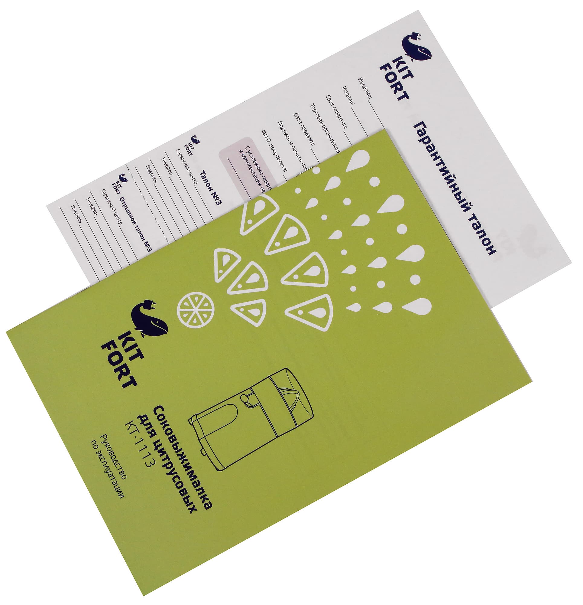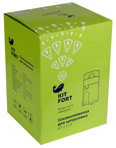 Соковыжималка Kitfort KT-1113 упакована в небольшую коробочку жизнерадостного салатового цвета. На упаковке видны традиционные элементы фирменного дизайна Kitfort — логотип, слоган, название прибора, его модель и графическое изображение. На боковых сторонах можно ознакомиться с техническими характеристиками и описанием соковыжималки. Коробка не перегружена информацией, однако все важные сведения представлены. Ручкой для переноски не оснащена. Сбор устройства в упаковку не представляется сложным.