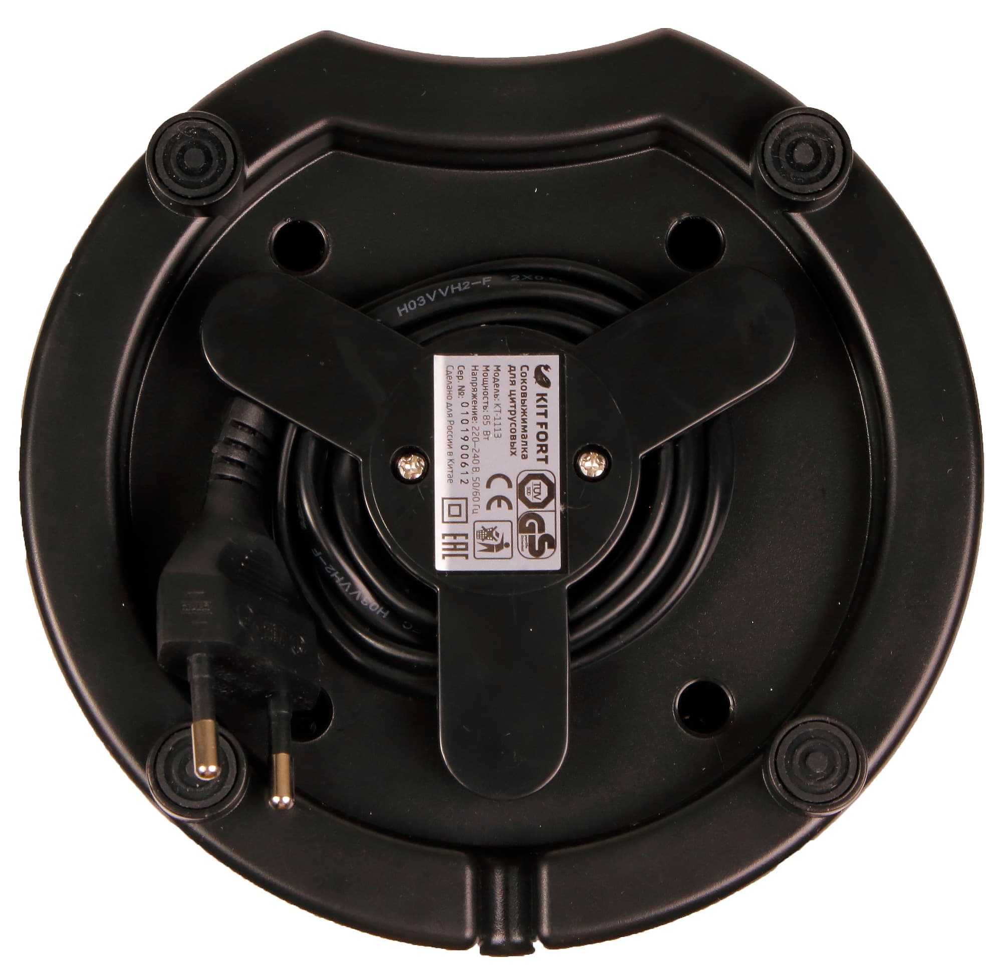 Прибор оснащен четырьмя ножками высотой примерно 7 мм. На каждой из ножек имеется резиновая вставка для лучшего сцепления с поверхностью стола. Это позволит корпусу находиться в неподвижности и не сдвигаться во время работы. Со стороны дна также можно увидеть отсек для сматывания шнура — отличное решение, которое мы всячески одобряем, и наклейку с технической информацией о соковыжималке.