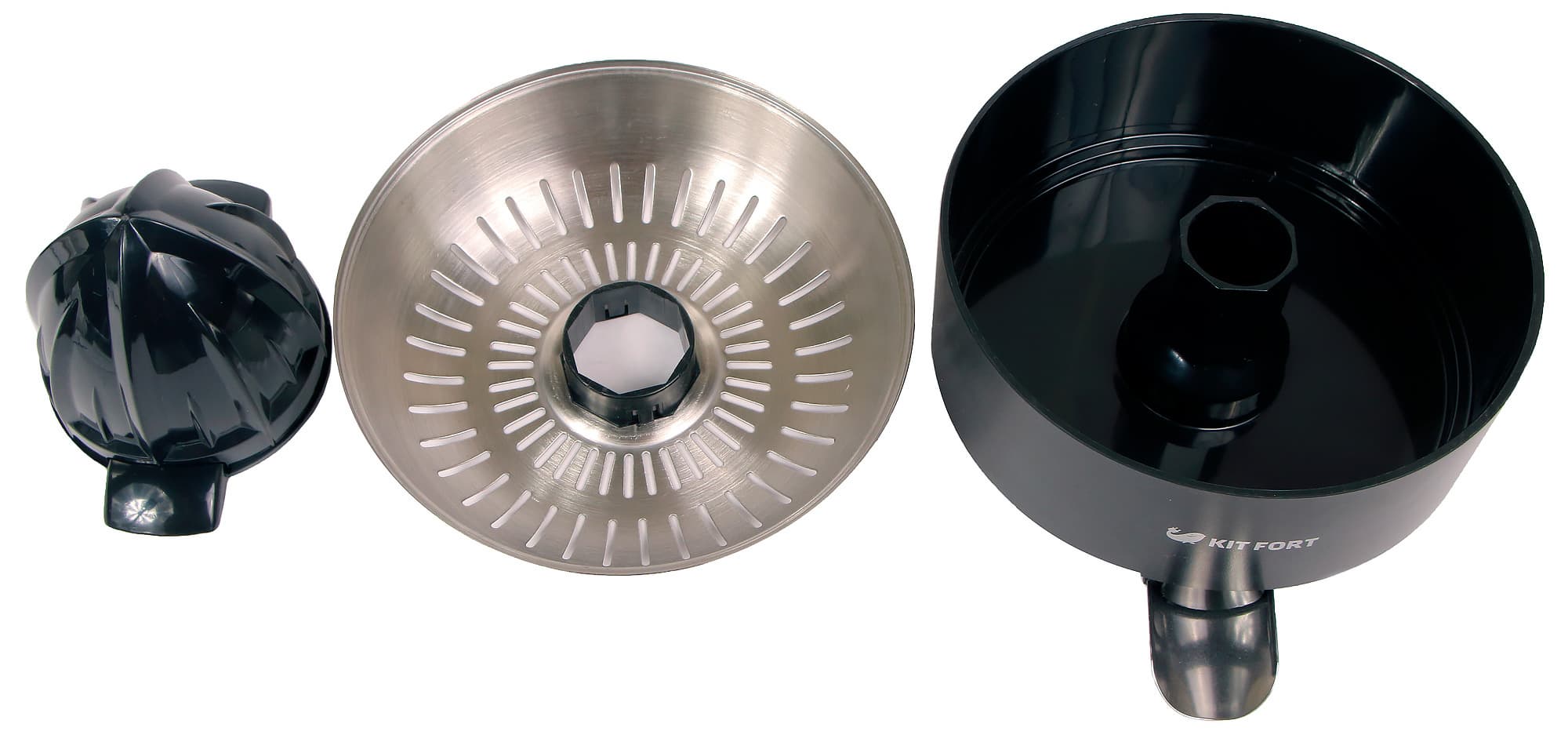 Насадки для отжима представляют собой конусы разного диаметра с рядом острых выступов. Малый конус вставляется внутрь большого, образуя единую конструкцию — стандартная, в общем, ситуация. Отметим наличие на насадке двух лепестков. Во время вращения конуса они сдвигают с сита мякоть цитрусовых, затрудняющую слив сока в лоток.