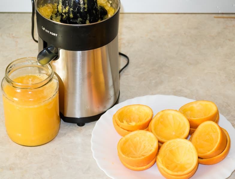 Кожура апельсинов выжата досуха. При этом насадка для отжима не срывала мякоть с внутренней стороны шкурки, а деликатно выдавливала сок, не повреждая цитрусовые.