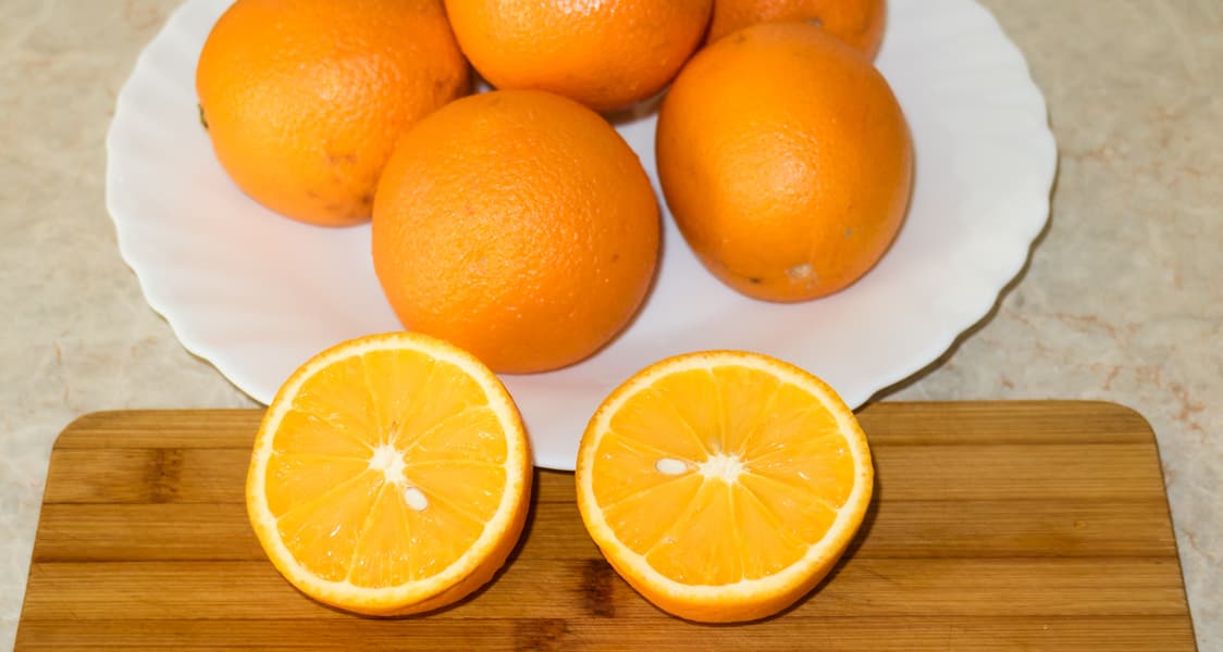 Вес неочищенных апельсинов составил почти ровно килограмм — 1,012 кг. Вымыли и разрезали все апельсины на две половинки.