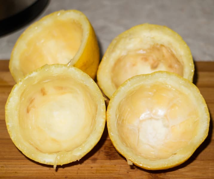 Вес получившегося сока — 118 г, или 47% выхода. Это отличный результат для лимонов. Отличный и, судя по состоянию кожуры, ожидаемый. Вся мякоть отжата, на кожуре остались лишь сухие волокна. Сам сок однородный, практически без мякоти.