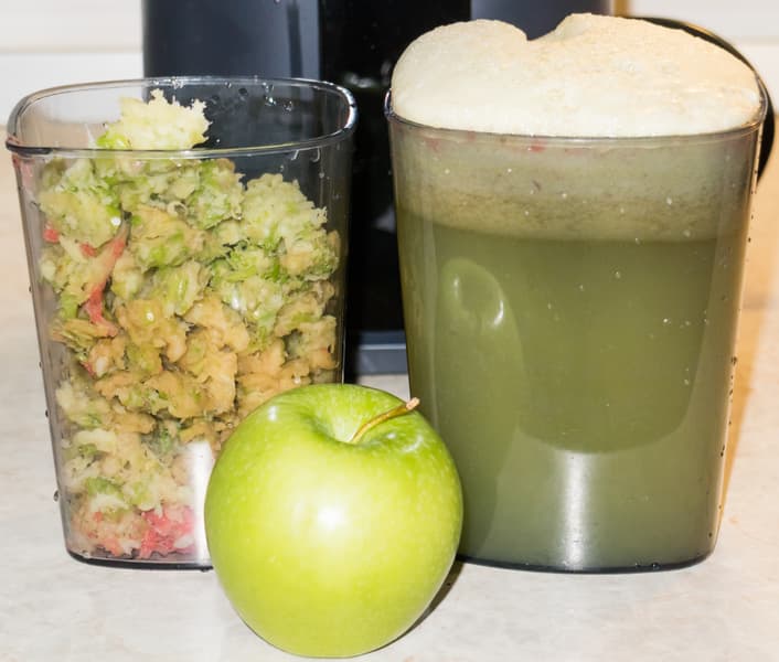 Сок с небольшим количеством мякоти, пены немного, жмых достаточно сухой.