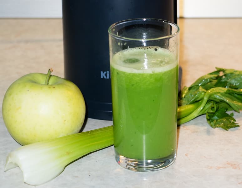 Из двух стеблей и одного яблока получили почти стакан довольно вкусного и, наверное, очень полезного сока. Жмых совершенно сухой, количество его невелико, представляет собой сильно спрессованные волокна сельдерея. Никаких затруднений в ходе переработки продуктов не испытано.