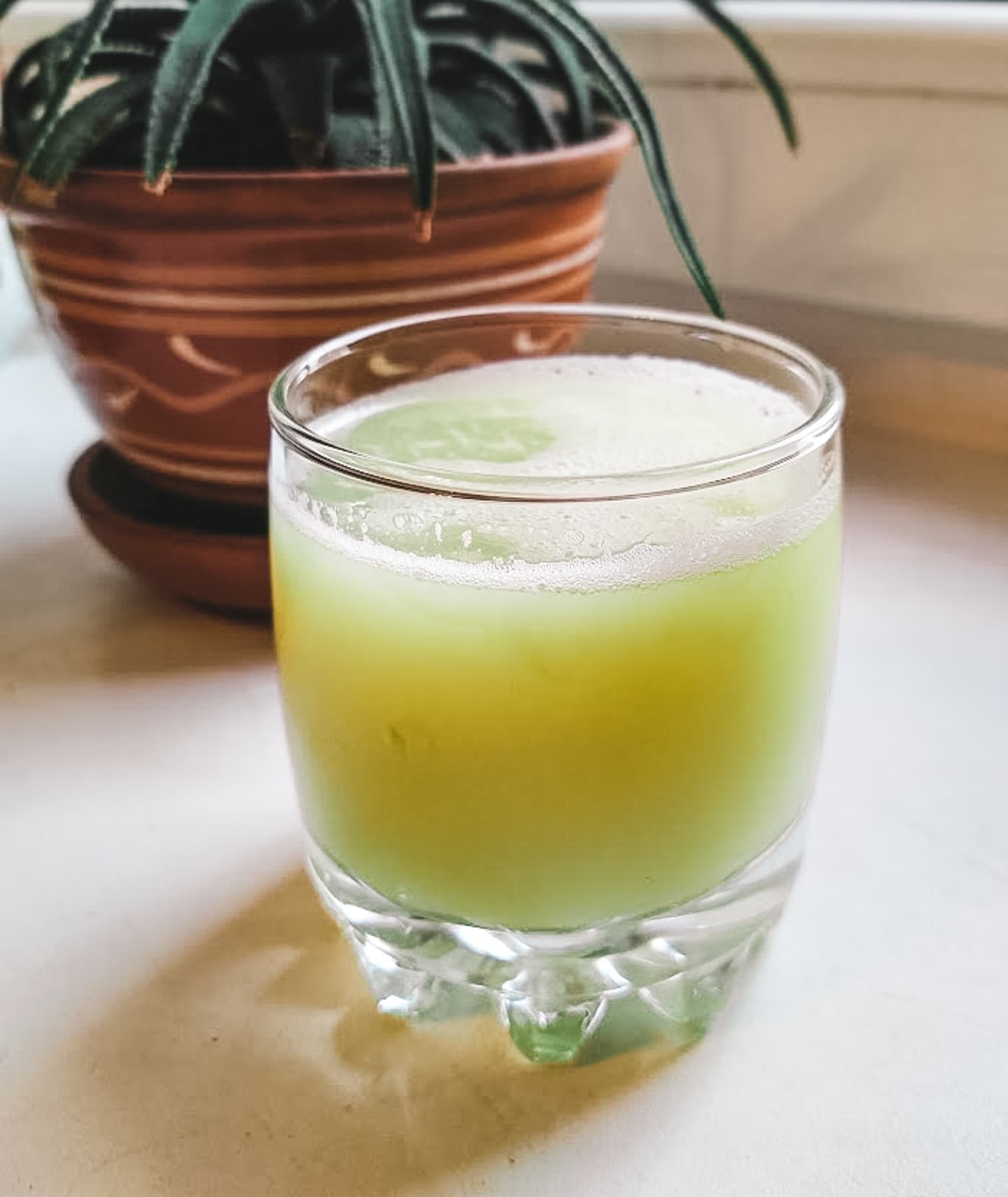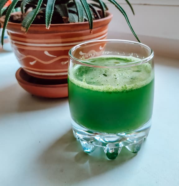 Сок цвета июньской листвы полупрозрачный, мякоти в нем не ощущается, но видны частички укропа и петрушки. Огурцы и зелень были извлечены из холодильника прямо перед отжимом, и сок был ледяным — подтверждение тому, что продукты в нашей соковыжималке не нагреваются, то есть максимально сохраняют свои свойства.