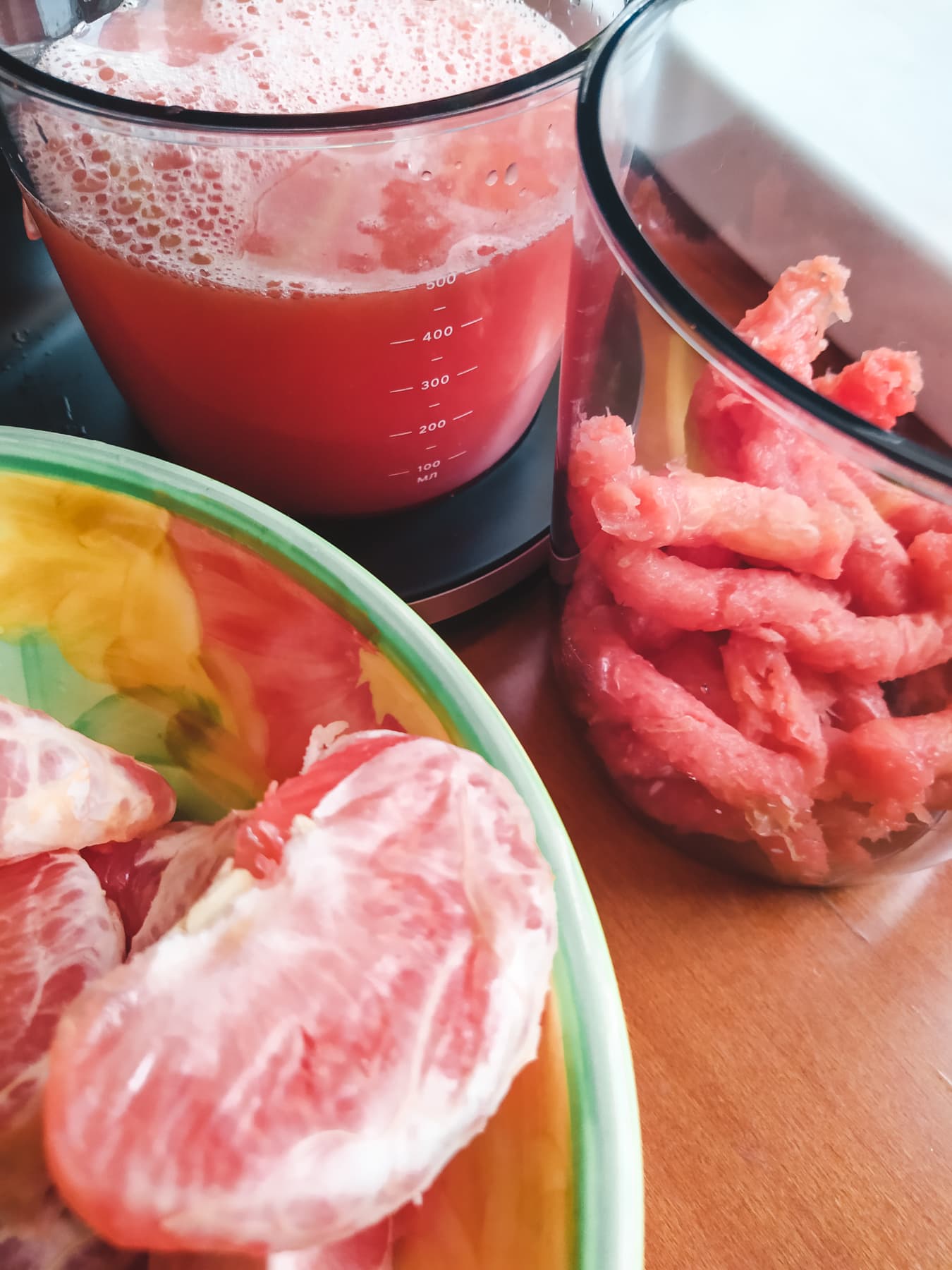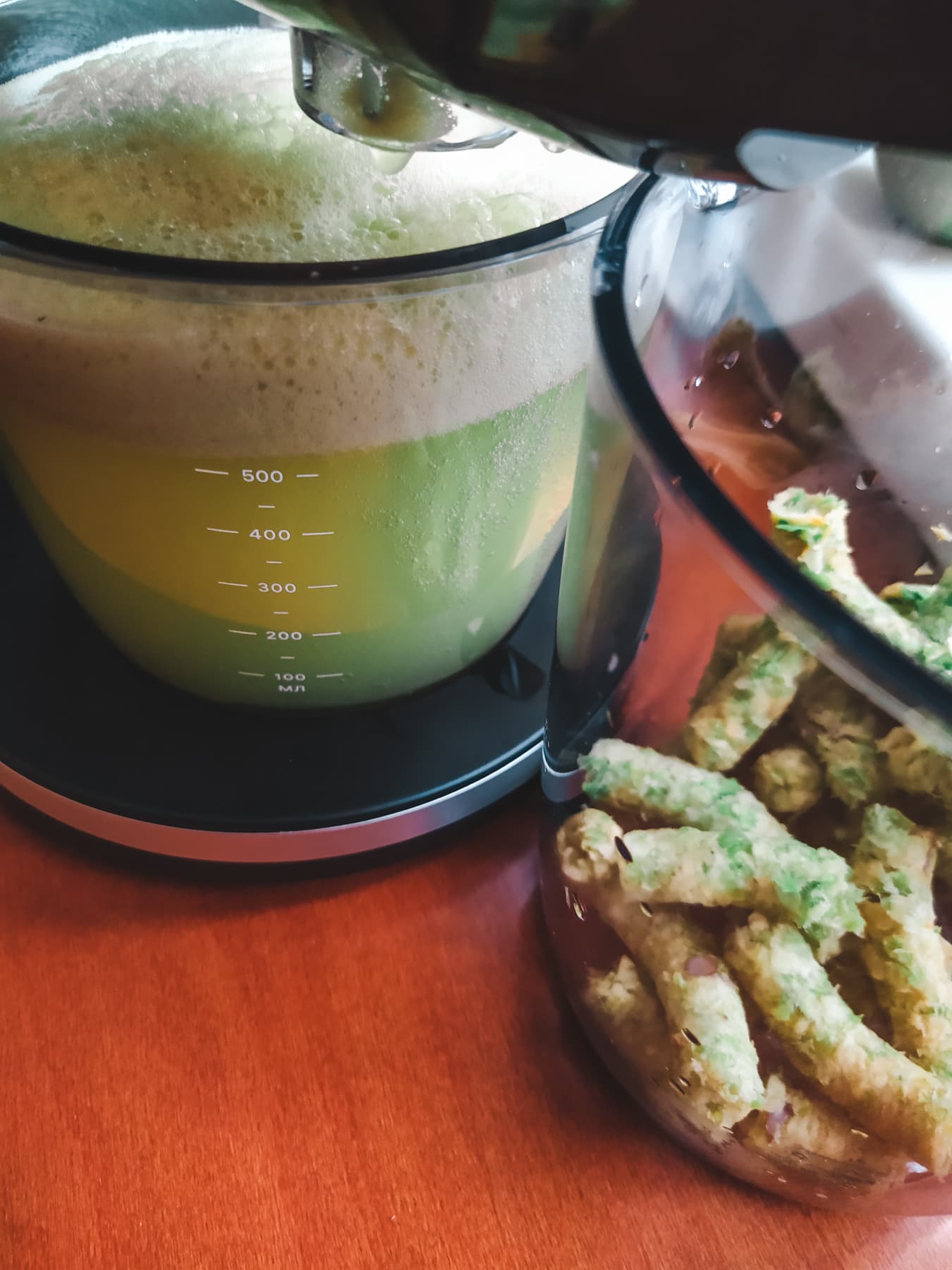 Скрипела соковыжималка 7 минут 59 секунд, выдав по итогу 472 грамма сока.
