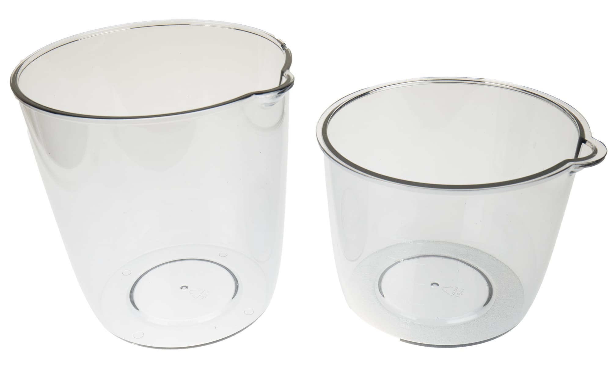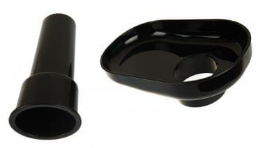 Контейнеры для сока (650 мл) и для жмыха (1000 мл) выполнены из того же материала, что и отжимной блок, — на вид не очень прочного. У каждого есть носик. На емкость для сока нанесены риски (от 100 до 500 мл с шагом 50 мл). Стаканы имеют одинаковую форму, так что один вставляется в другой, экономя место для хранения. Лоток и толкатель — из того же прочного черного пластика, что и зажим. Лоток такой маленький, что размещать на нем продукты бессмысленно — проще уж сразу забрасывать в горловину по кусочку.