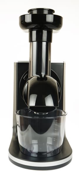 Визуально, да, в принципе, и функционально, прибор очень напоминает мясорубку. К серебристо-черному корпусу крепится начиненный шнеком и фильтром отжимной блок, снизу в контейнер стекает сок, а жмых выходит из отверстия в зажиме. Моторный блок одет в приятный на ощупь матовый пластик.