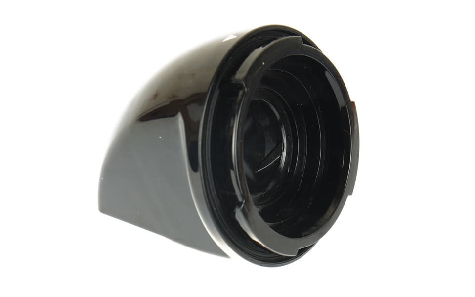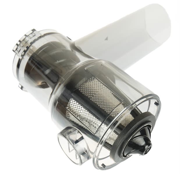 Пустой отжимной блок вставлется в моторный блок под углом около 30 °C и закрепляется поворотом против часовой стрелки до щелчка, затем уже в него устанавливаются шнек, фильтр и зажим. Чтобы разобрать соковыжималку, достаточно нажать на кнопку слева и повернуть отжимной блок по часовой стрелке.