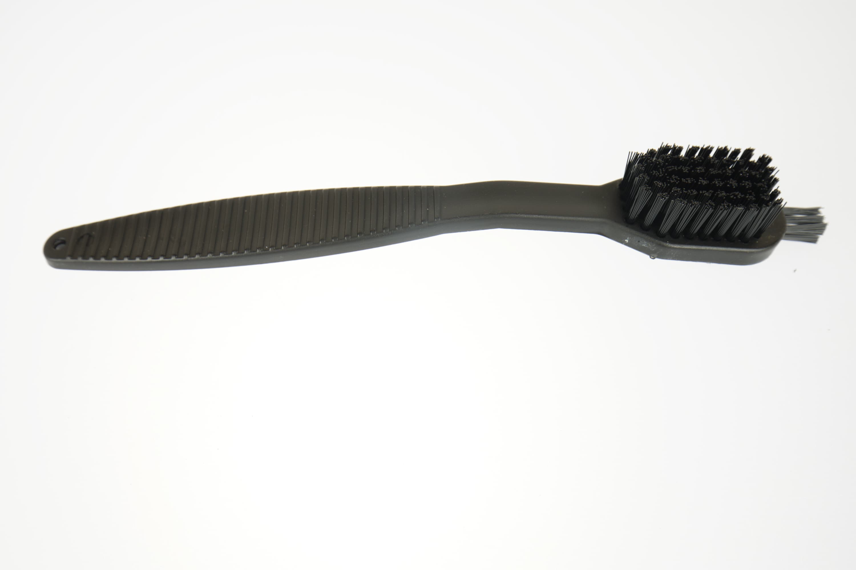У щеточки две рабочие поверхности. Одна широкая, напоминающая зубную щетку, вторая — всего из шести пучков щетинок — для очистки труднодоступных мест.