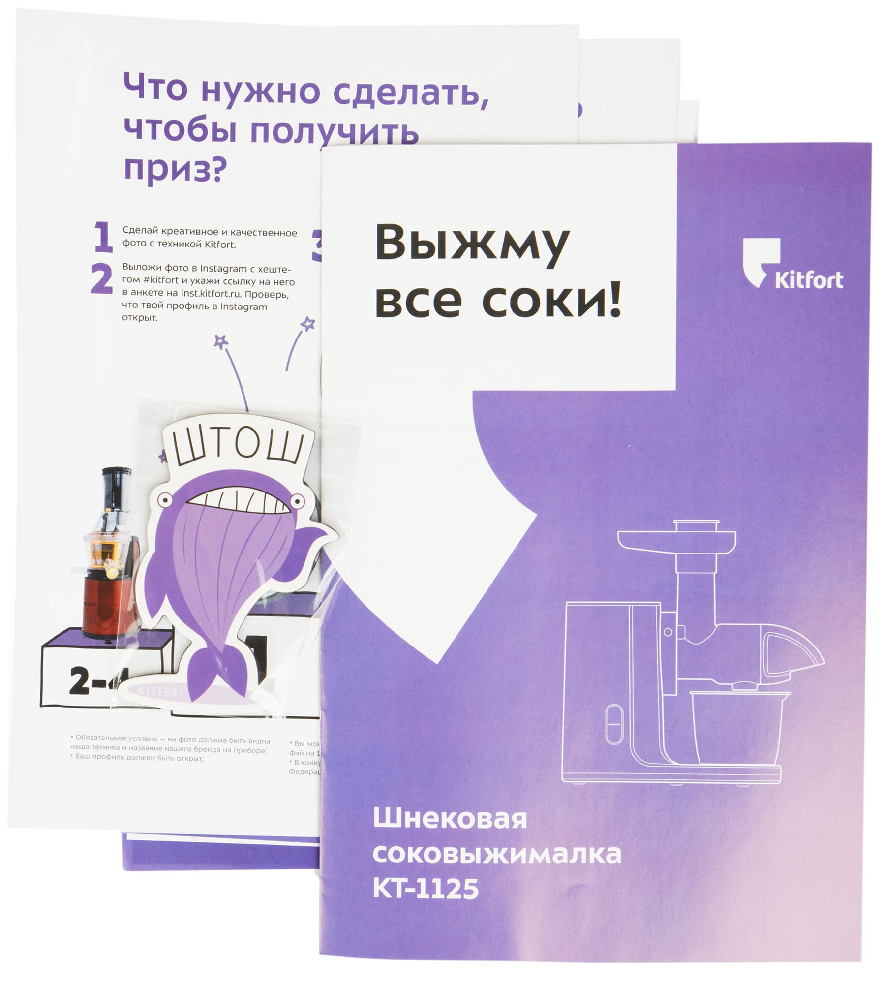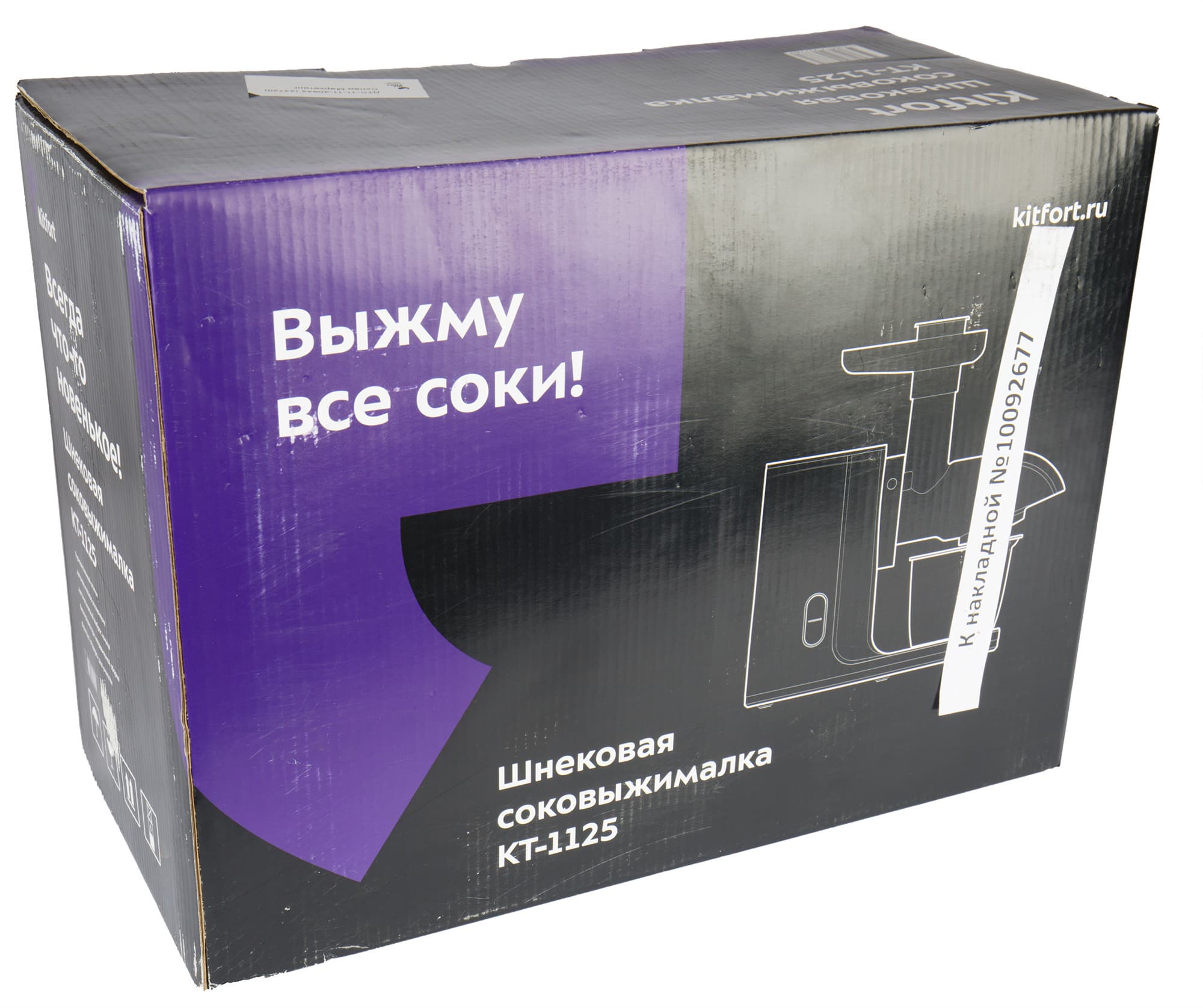 Я милого узнаю по коробке: Kitfort верен традициям. На черном фоне — векторное изображение прибора, а в левом верхнем углу — фиолетовая вставка со слоганом. На боковых сторонах представлены сведения о технических характеристиках и достоинствах соковыжималки. Ручкой для переноски упаковка не снабжена.