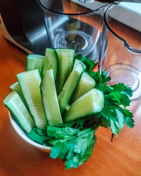 Больше овощей богу овощей! Огурцы, нарезанные тонкими ломтиками, дополнили петрушкой и укропом.
