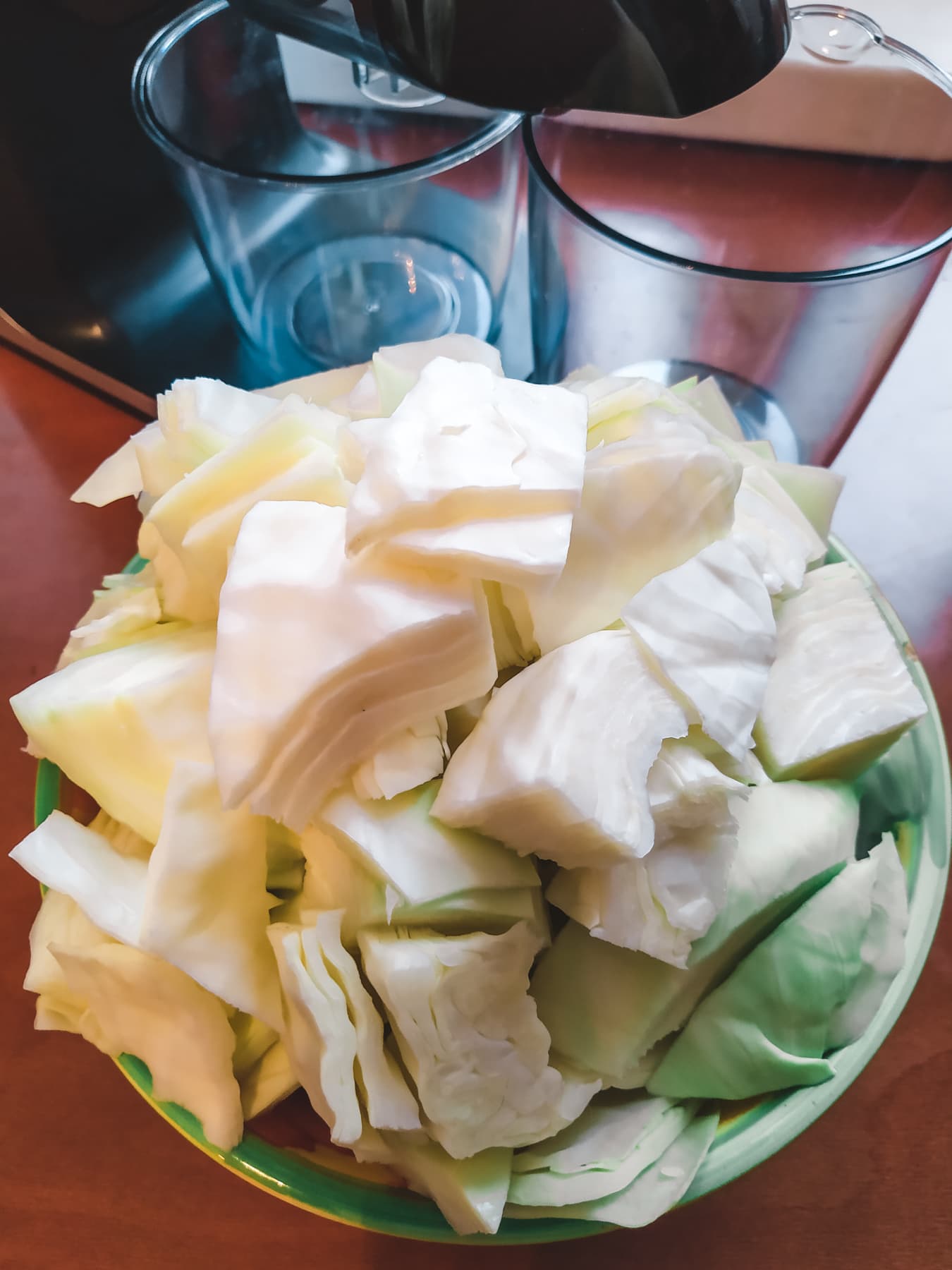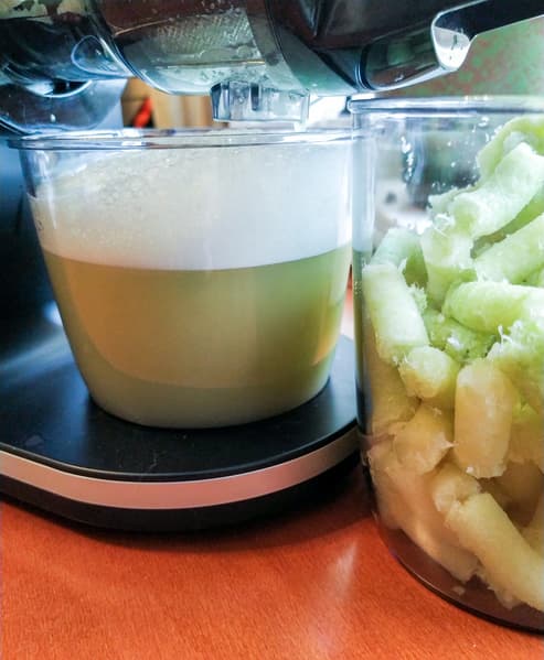 Отжим сока снова сопровождался кошмарным скрипом и вообще затянулся — капуста захватывалась шнеком с горем пополам, приходилось активно работать толкателем и один раз включить реверс. Впрочем, таковы особенности сырья — куски капусты в горловине разлетались на отдельные листы и либо утрамбовывались в камере, либо отправлялись в свободный полет по горловине. В итоге в контейнере оказался мутный сок, хотя мякоти в нем не ощущалось. Соотношение пены и сока визуально примерно 1:2. В лаборатории повис резкий запах капусты.