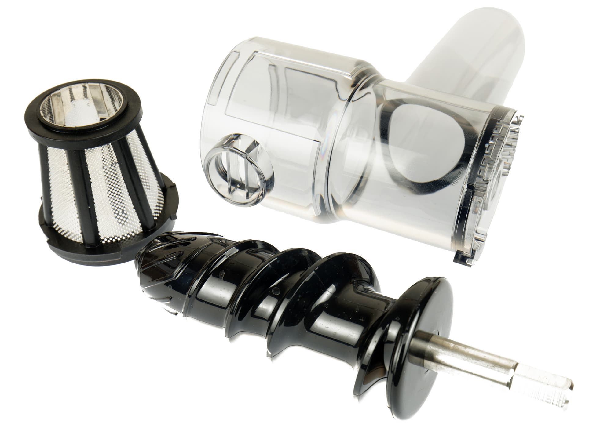 Отжимной блок прозрачный — наблюдать происходящее с овощами и фруктами можно будет в прямом эфире. Увесистый шнек выглядит готовым к работе с самым сложным сырьем. Ячейки фильтра из нержавейки показались нам большими. В том смысле, что видали мы и помельче. Посмотрим, сколько будет в соке мякоти.